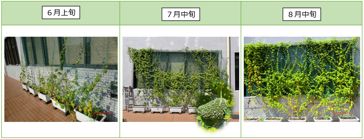 「緑のカーテン」とは、日当たりの良い窓際をゴーヤやアサガオなどのつる性の植物でカーテンのように覆い、夏の強い日差しを遮るものです。「緑のカーペット」はサツマイモなどを建物の屋上でカーペットのように育てて、カーテンと同じく夏の日差しを遮ります。