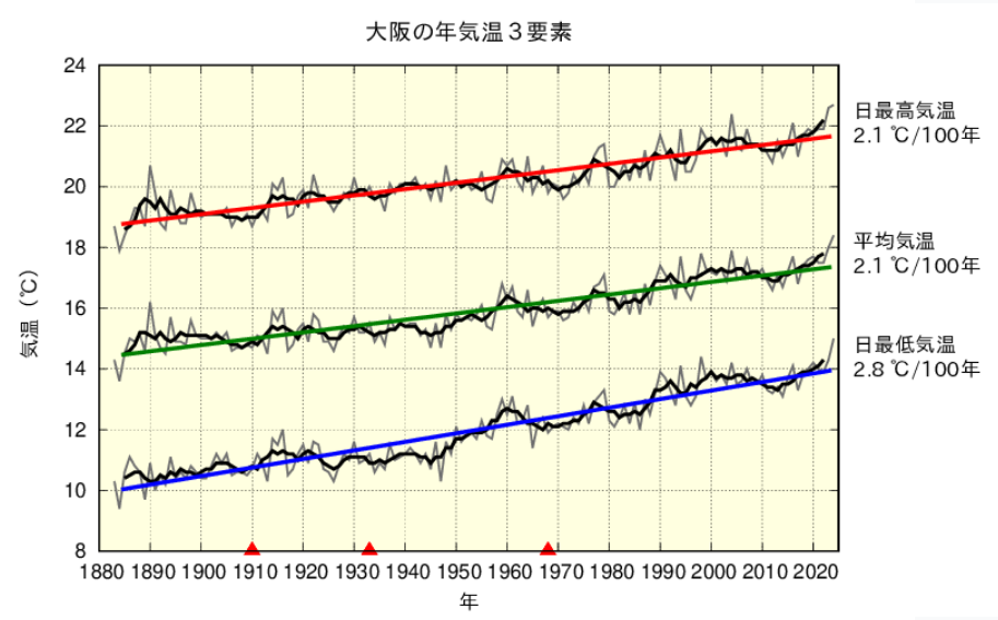 大阪では、地球温暖化に加えて都市化による影響が現れていると考えられ、平均気温はこの100年で2.1度上昇しています。