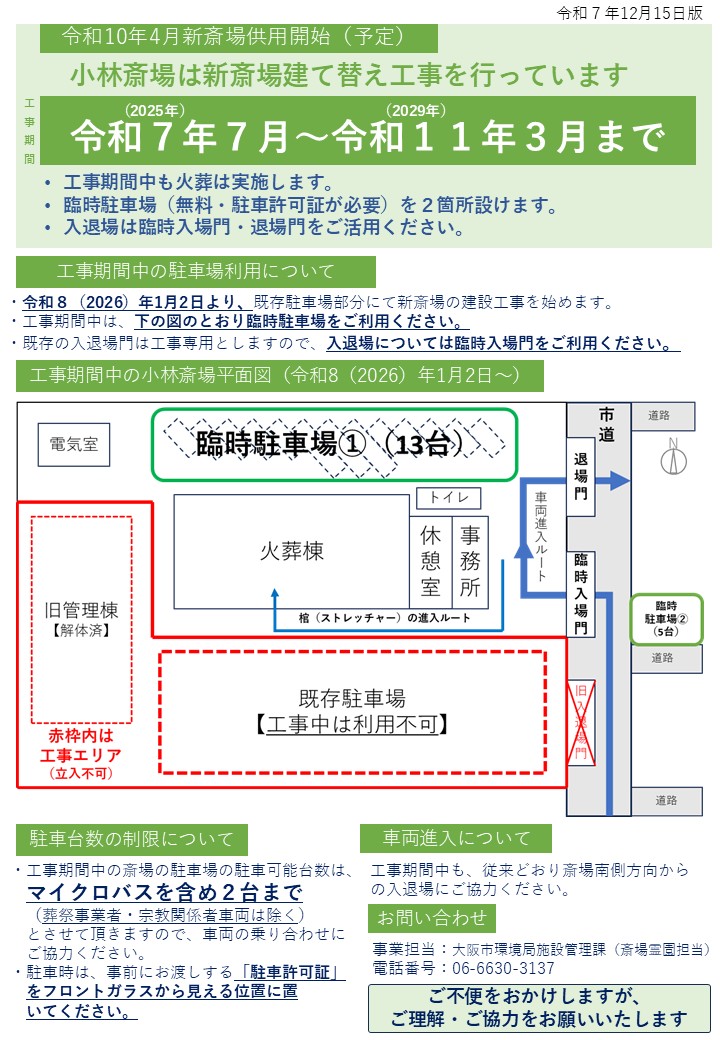 - 現在、建替工事を実施しており、式場の利用停止や斎場への車両の進入ルートおよび駐車場の利用方法等を変更しています。(火葬は通常通り実施しています。)詳細は「小林斎場建替工事に伴うレイアウト等の変更について」をご覧ください。
