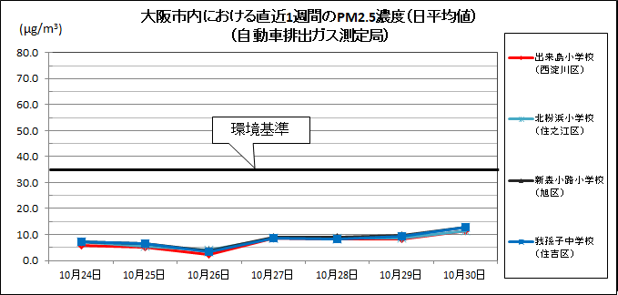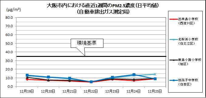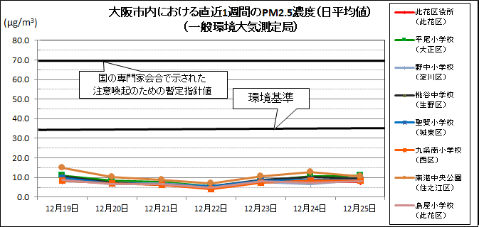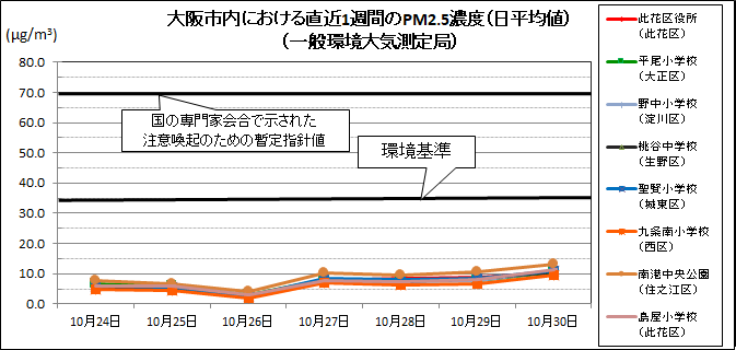 大阪市内における直近1週間のPM2.5濃度及びその推移については、以下のとおりとなっています。