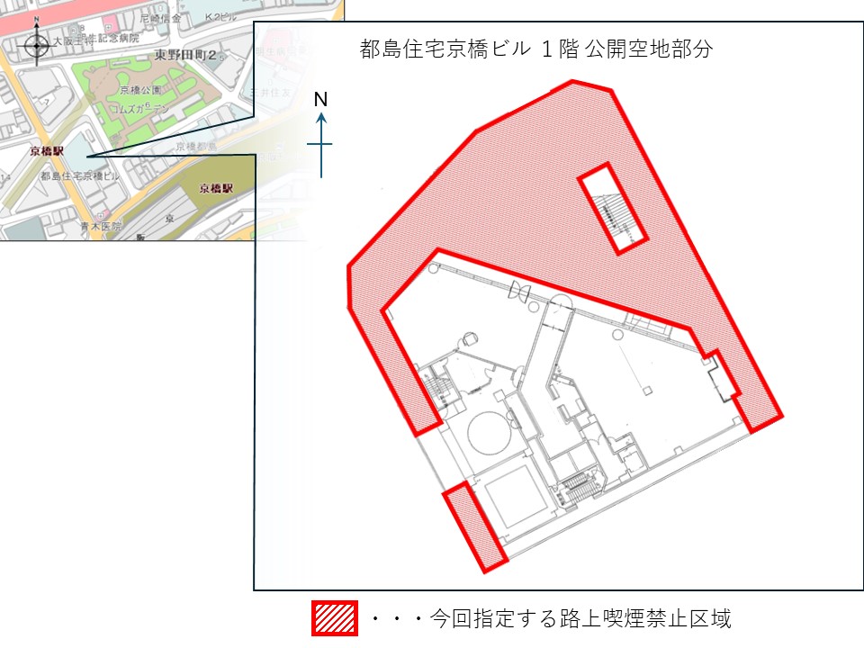 大阪市と都島住宅株式会社は、大阪市路上喫煙の防止に関する条例(平成19年大阪市条例第54号)第6条第1項に定める道路等を管理する権原を有する者と合意書を締結し、都島住宅京橋ビルの公開空地は路上喫煙禁止区域となりました。