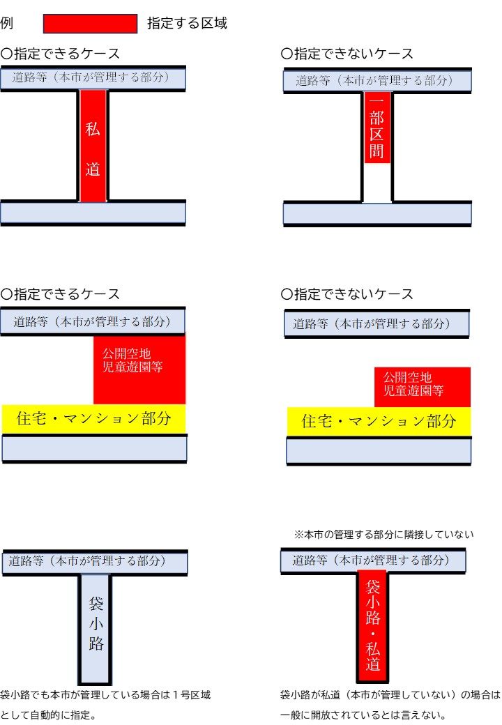 2号区域の指定にあたっては、対象となる道路等が要件に該当するとともに、本市において指定を行う必要があると認めたときは、書面により合意をしたうえで、指定を行うものとしています。