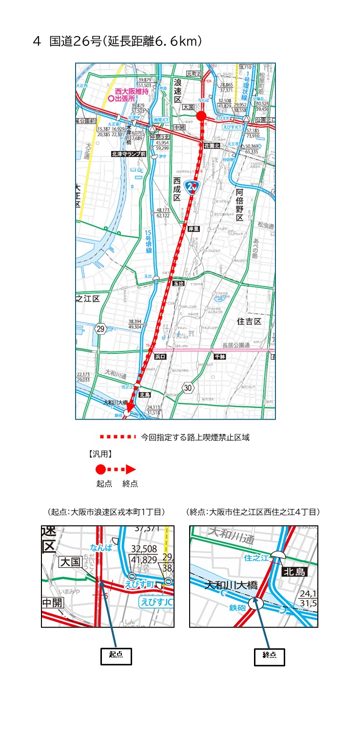 | 国道26号 | 大阪市浪速区戎本町1丁目 | 大阪市住之江区西住之江4丁目 | 6.6km |