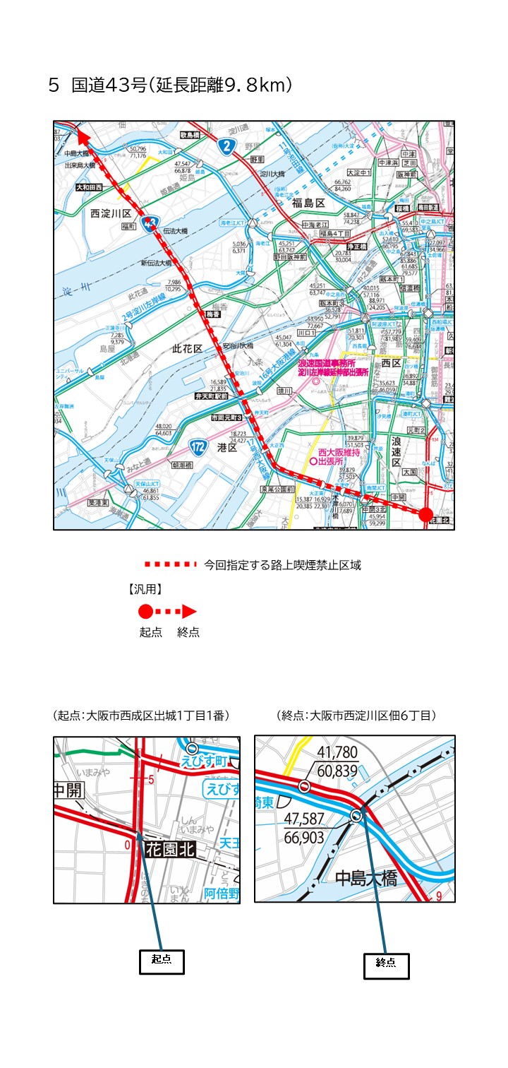 | 国道43号 | 大阪市西成区出城1丁目1番 | 大阪市西淀川区佃6丁目 | 9.8km |