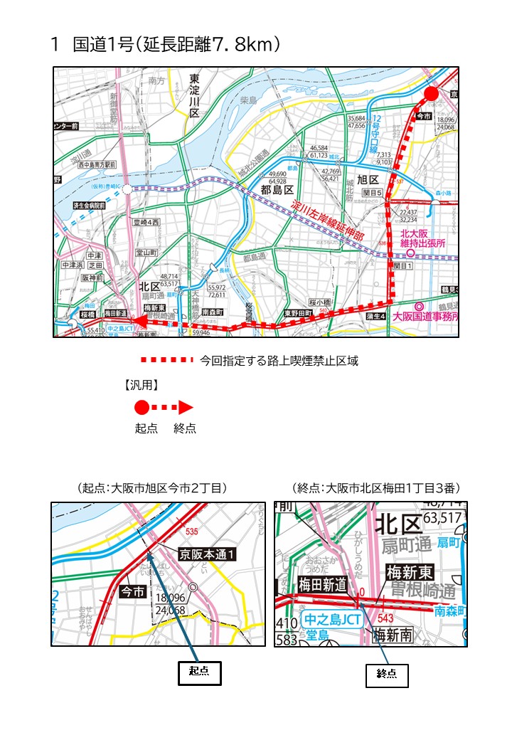 | 国道1号 | 大阪市旭区今市2丁目 | 大阪市北区梅田1丁目3番 | 7.8km |