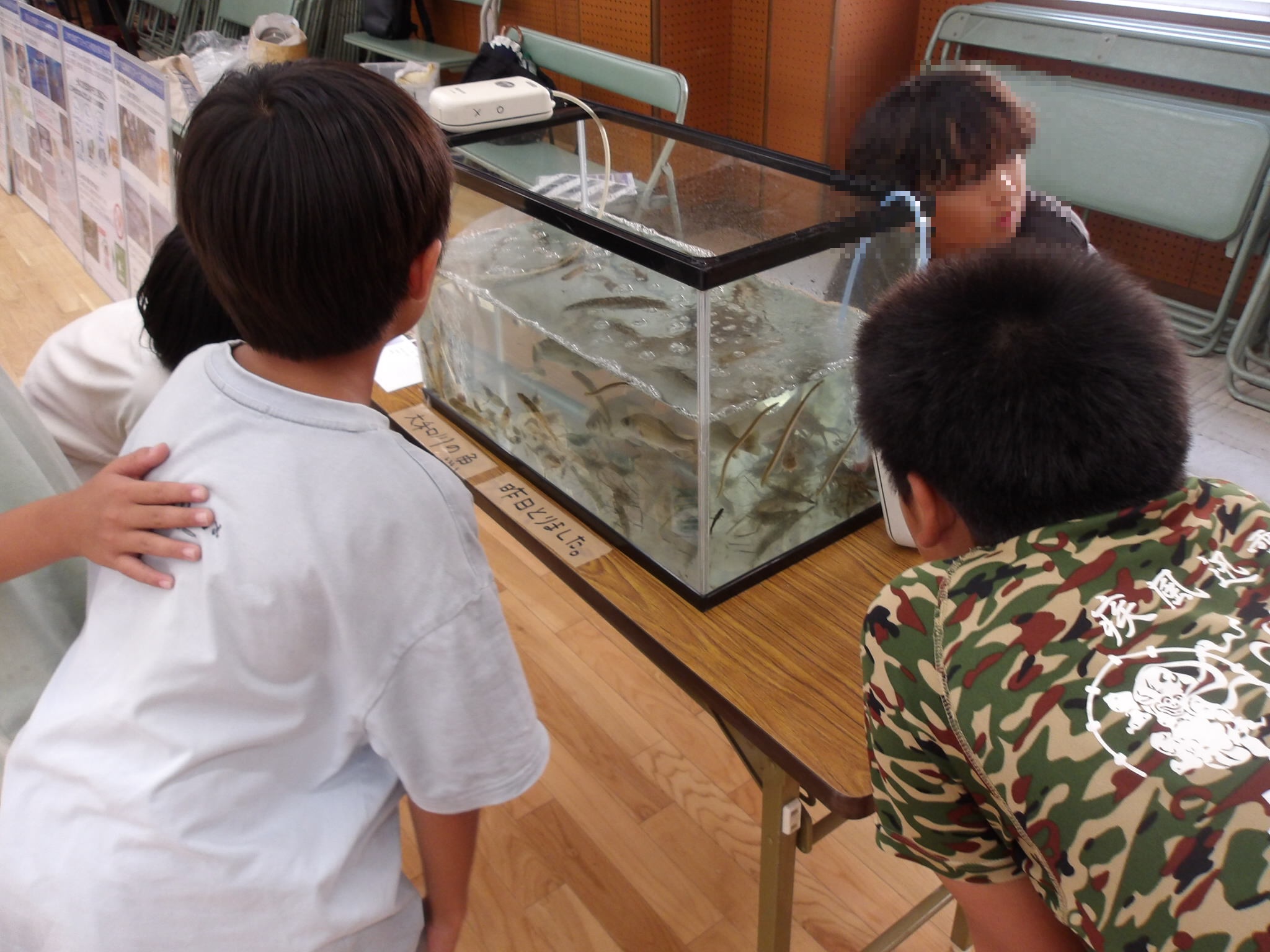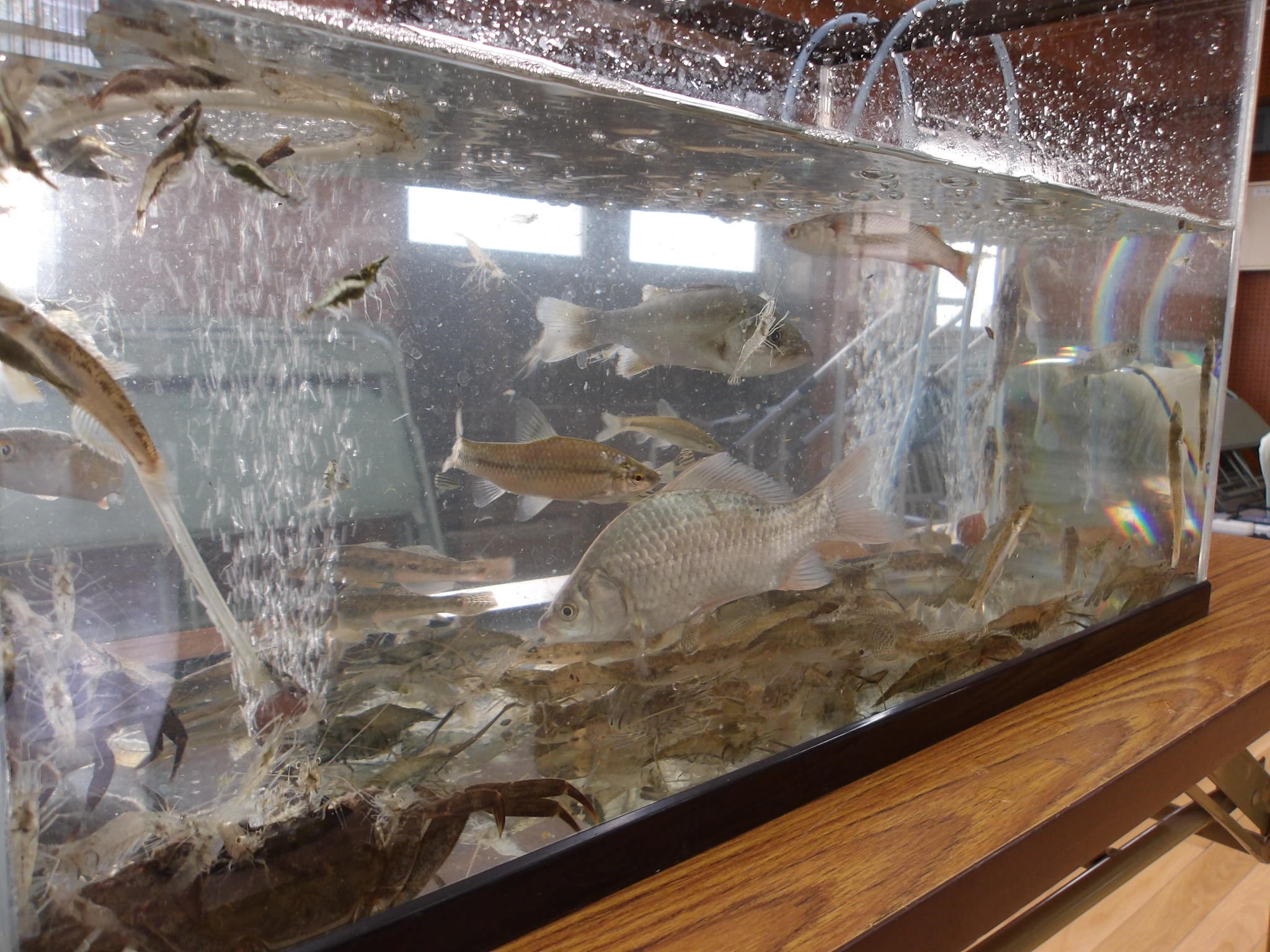 大和川でとれた魚などを展示し、大和川の水生生物や水環境、海洋プラスチックごみ問題についてお話をしたり、河川敷の砂に含まれたマイクロプラスチックをふるいを使って実際に見てもらったり、大和川の水を用いた簡易水質実験を行い、身近にある豊かな自然や海洋プラスチックごみ問題などの環境問題について理解を深めてもらいました。