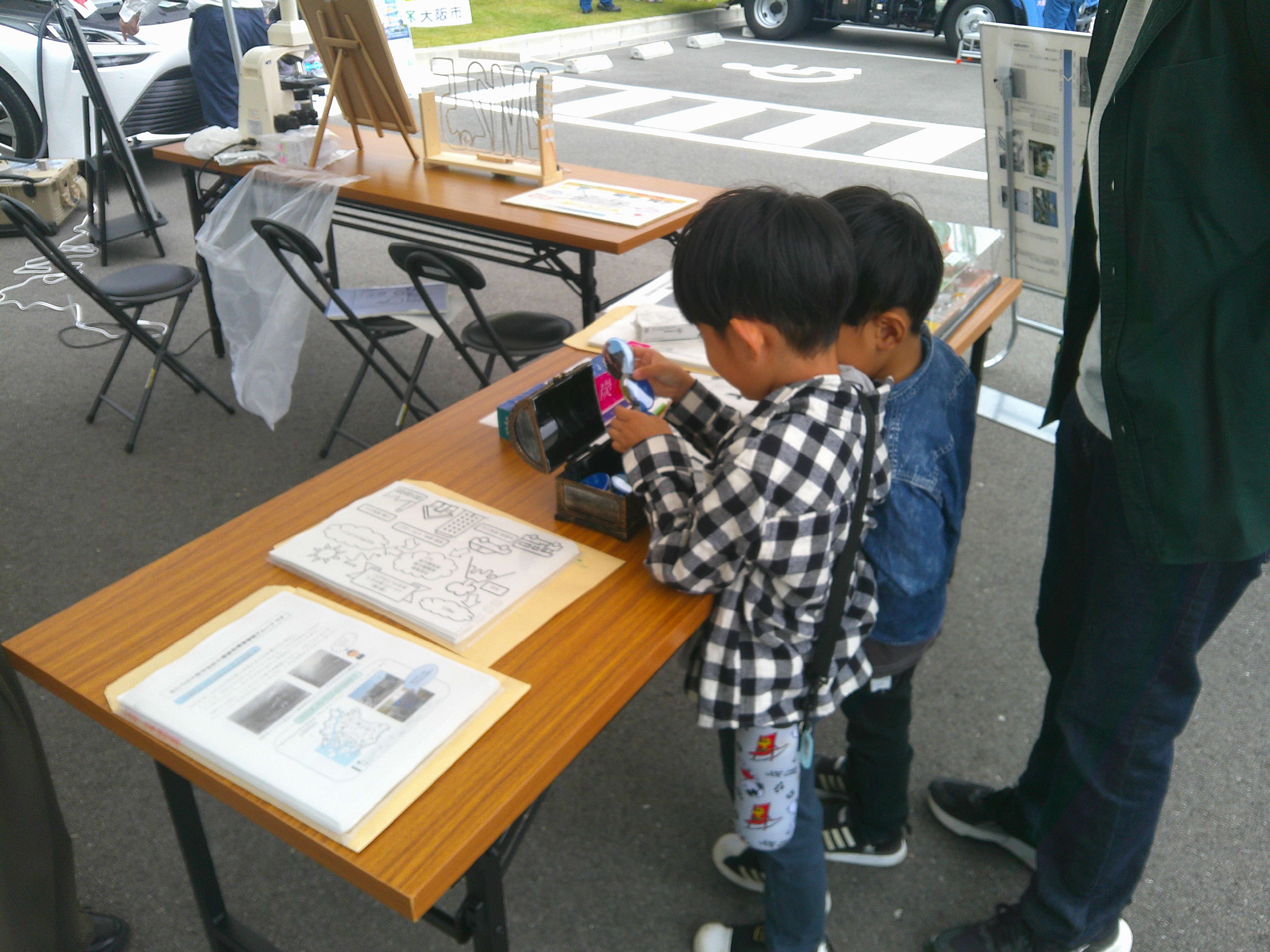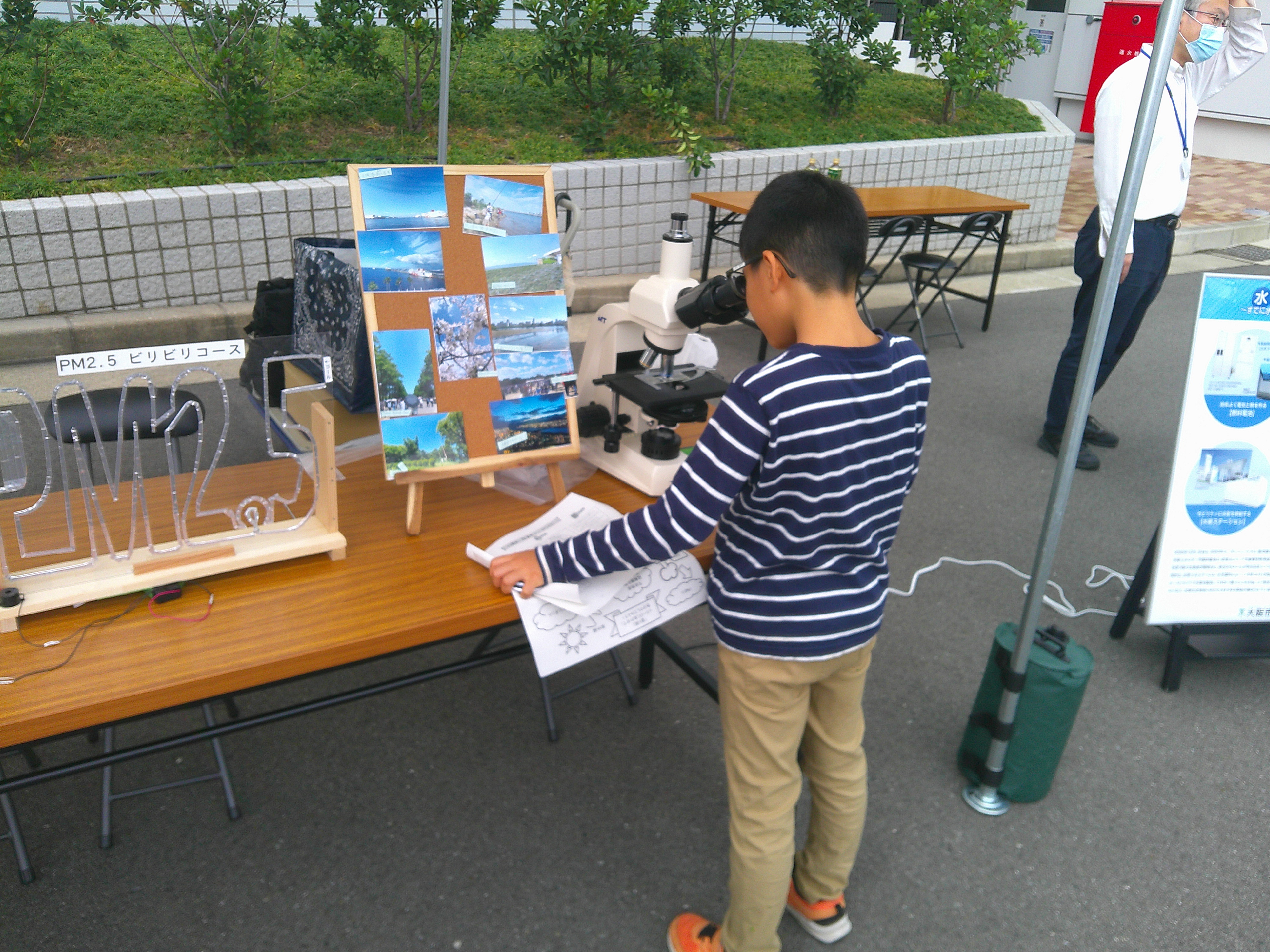 このイベントは、市民の皆様から排出されたごみが焼却工場でどのように処理されているのかを実際に見ていただき、ごみ処理についてより身近に関心を持っていただくため開催されました。当課は、焼却炉などばい煙を発生する施設や自動車等が発生源となる微小粒子状物質(PM2.5)等に関するパネル展示ほか、顕微鏡によるPM2.5の観察を実施し、参加者に対して大気環境の保全に関する啓発を行いました。