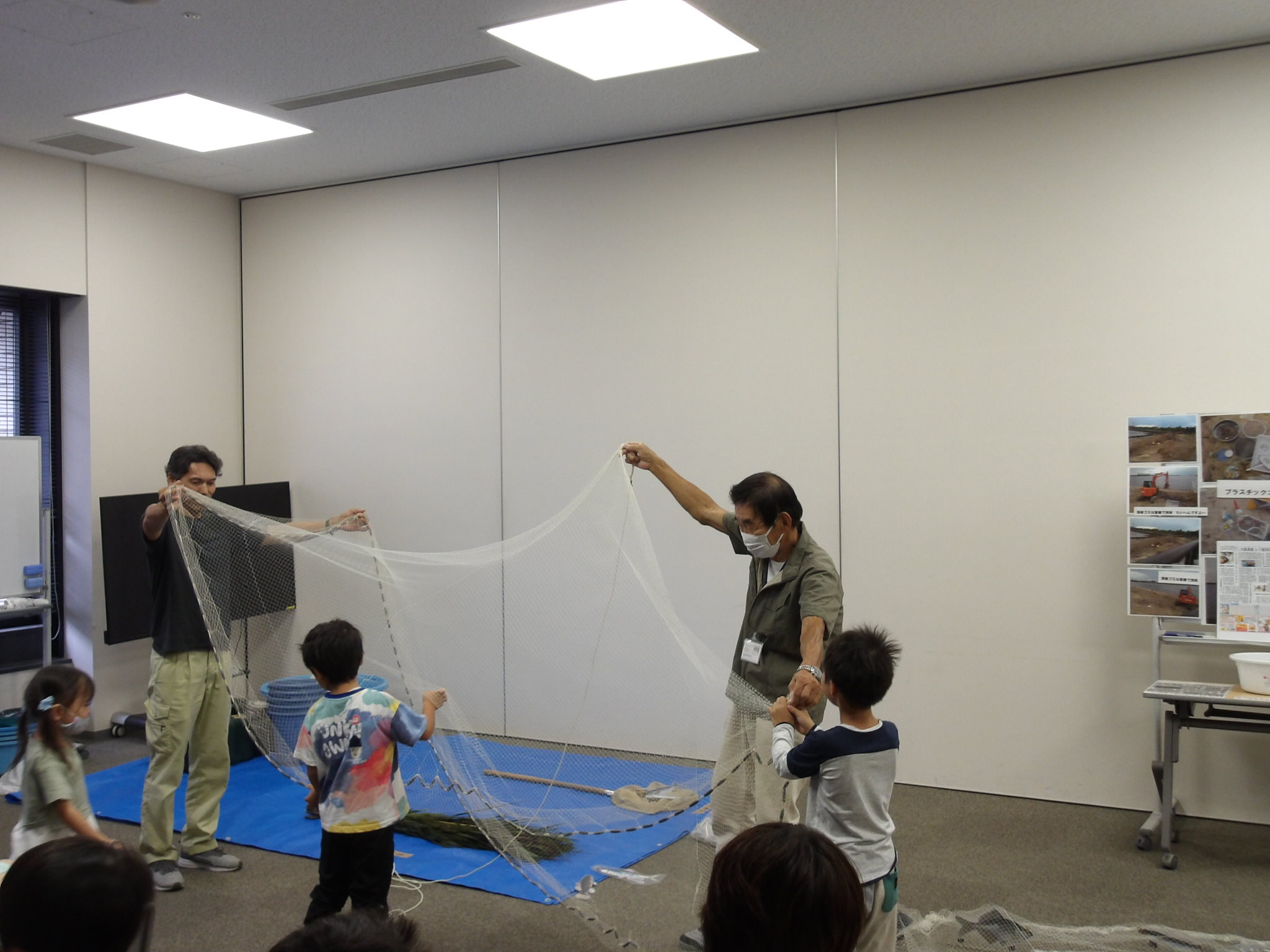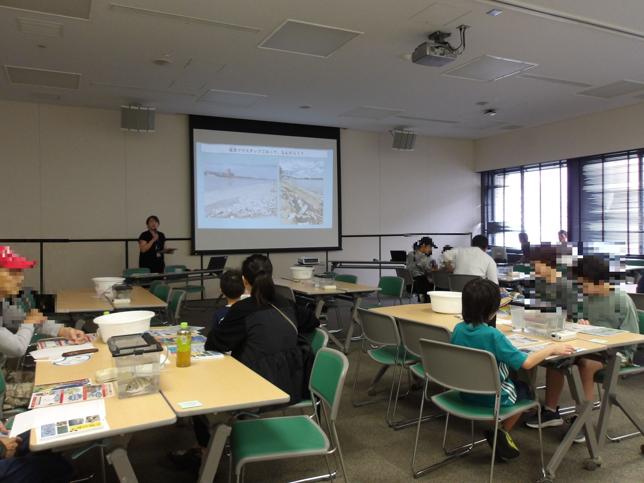 当日は悪天候により、開催場所を淀川河川敷十三エリア 十三船着場付近から淀川区役所会議室に変更となりましたが、淀川に生息する生き物の観察や淀川の水を用いた簡易水質実験を通じて、身近にある豊かな環境やその問題について楽しく学んでいただきました。また、海洋プラスチックごみ問題に関する話をお聞きいただくとともに、河川敷の砂に含まれるマイクロプラスチックをふるいを使って実際に確認し、海洋プラスチックごみ問題について理解を深めていただく機会にもなりました。