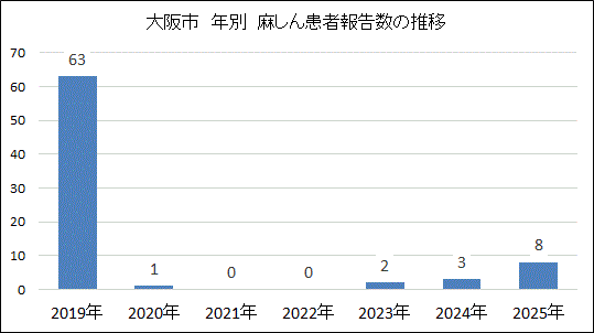 日本では麻しんは排除状態にあるとされており、大阪市でも例年は海外渡航歴がある方などで散発的に報告されています。