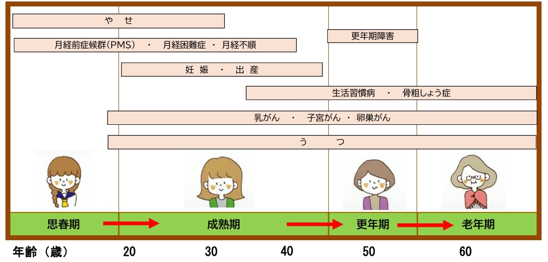 ⼥性の健康は、⽣涯にわたって⼥性ホルモン(エストロゲン)の影響を受けており、ライフステージごとにかかりやすい病気、症状などがあります。⾃分の現在地を確認し、いまと将来を⾒据えた病気の予防、健康づくりに取り組みましょう。