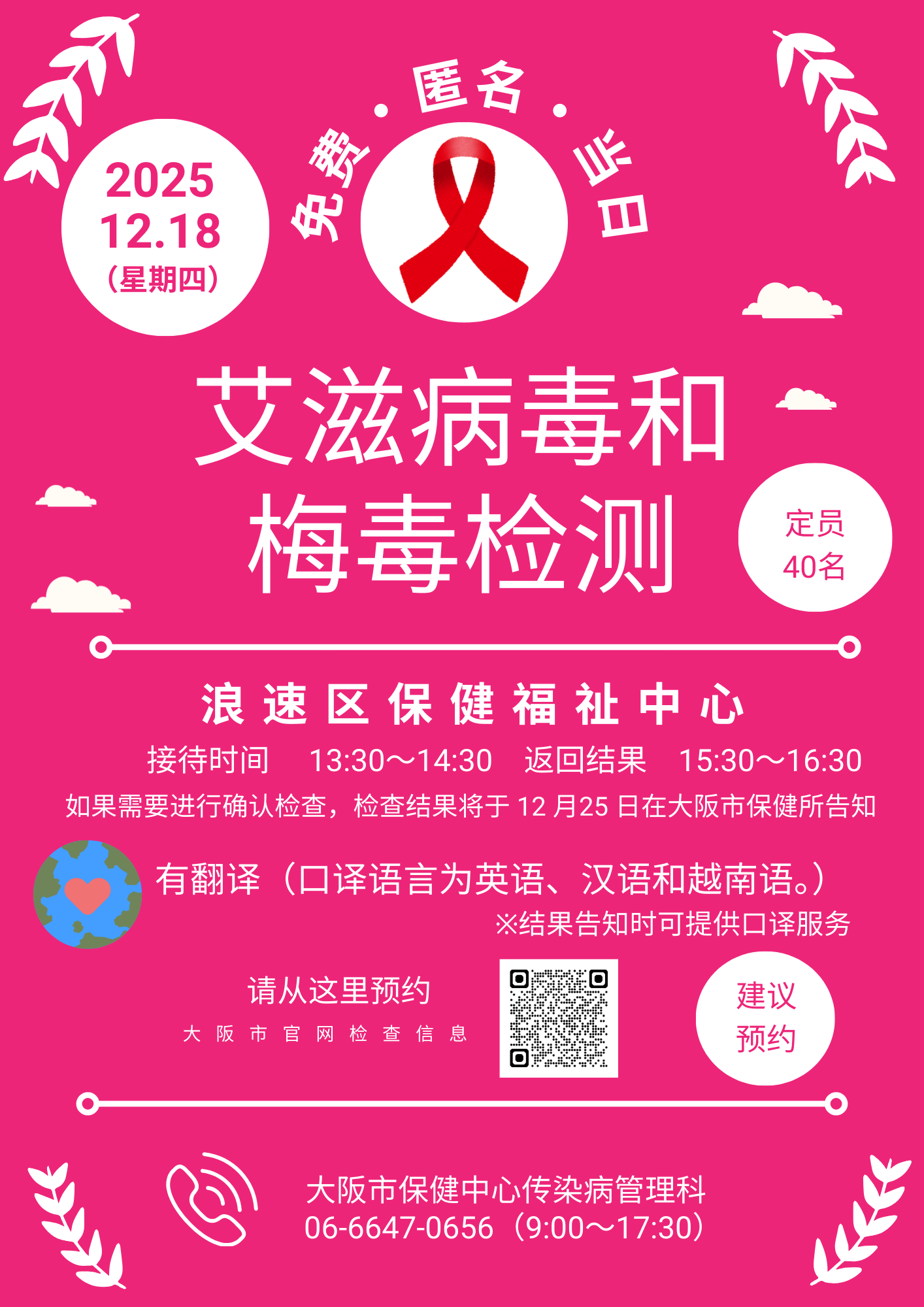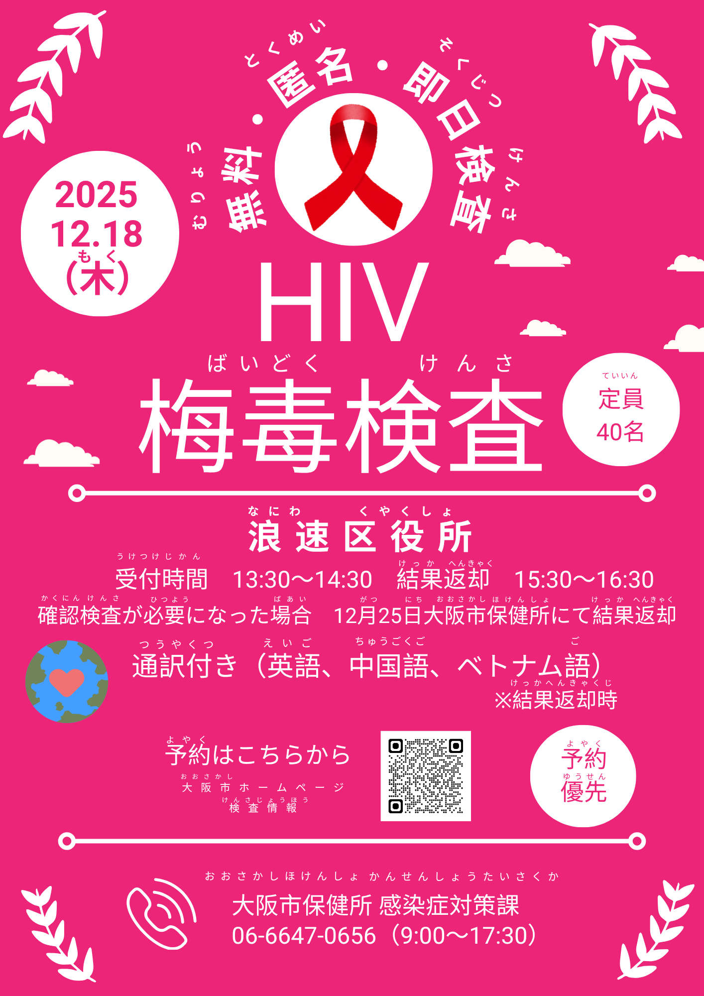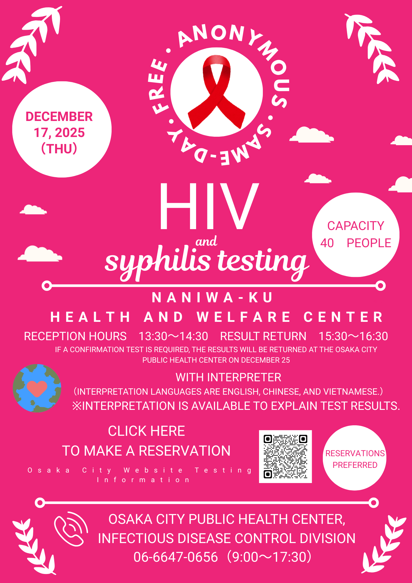 世界エイズデーイベントとして特設会場(浪速区役所)にて、HIV・梅毒の検査を実施します。