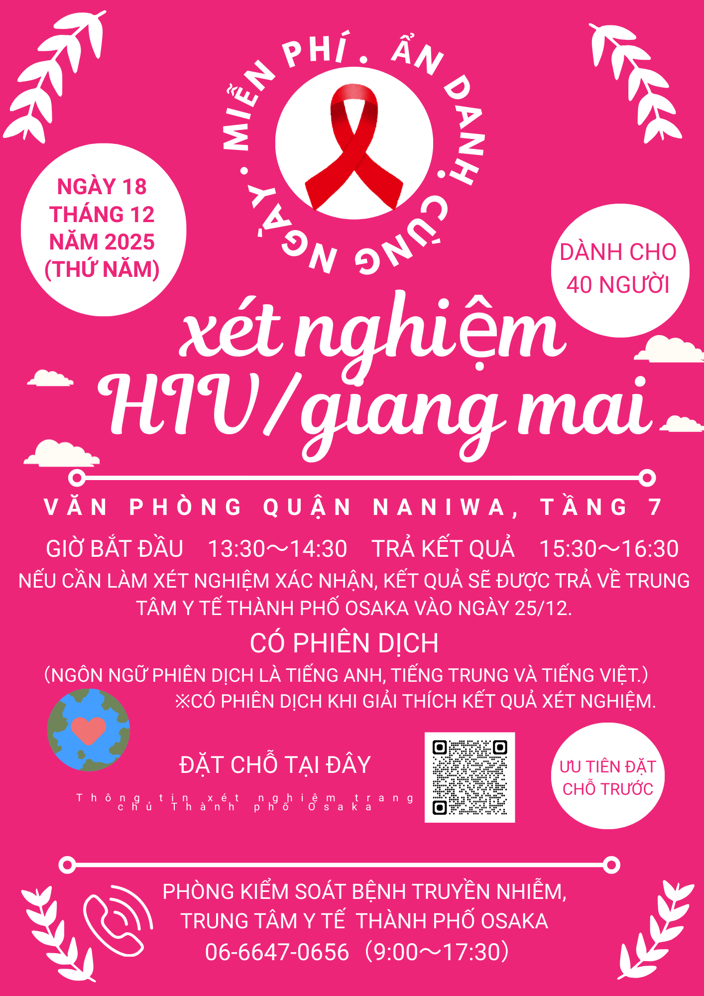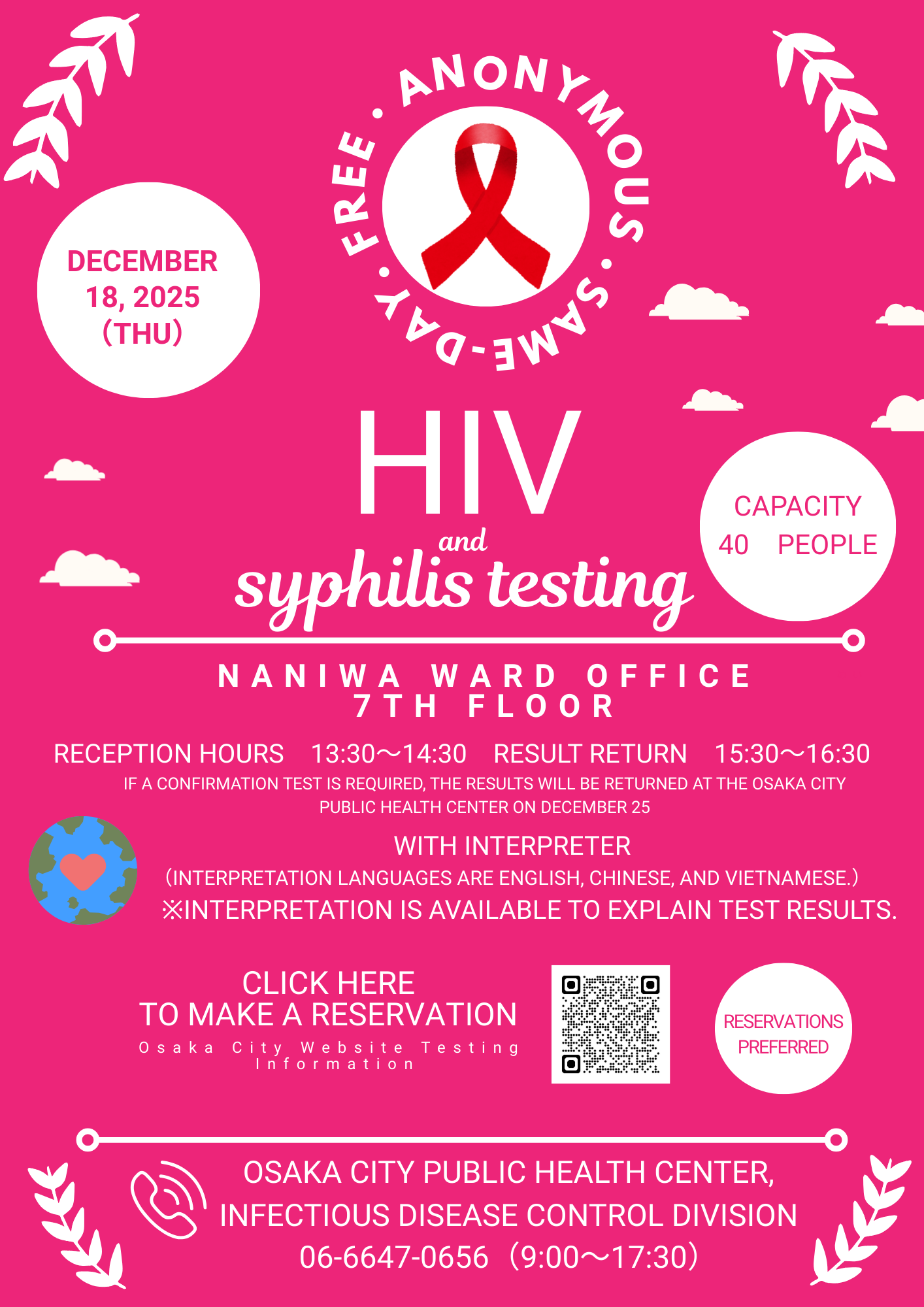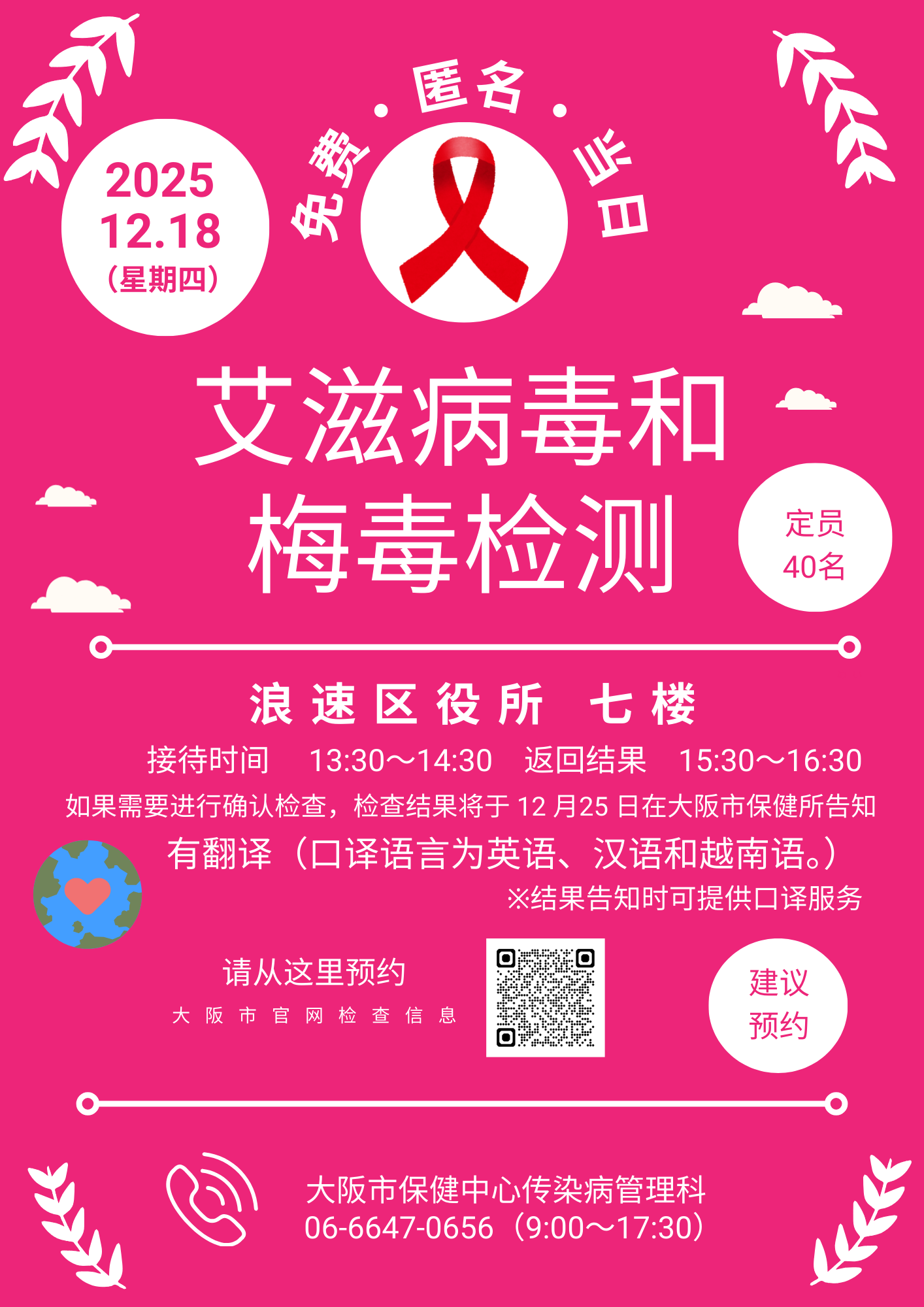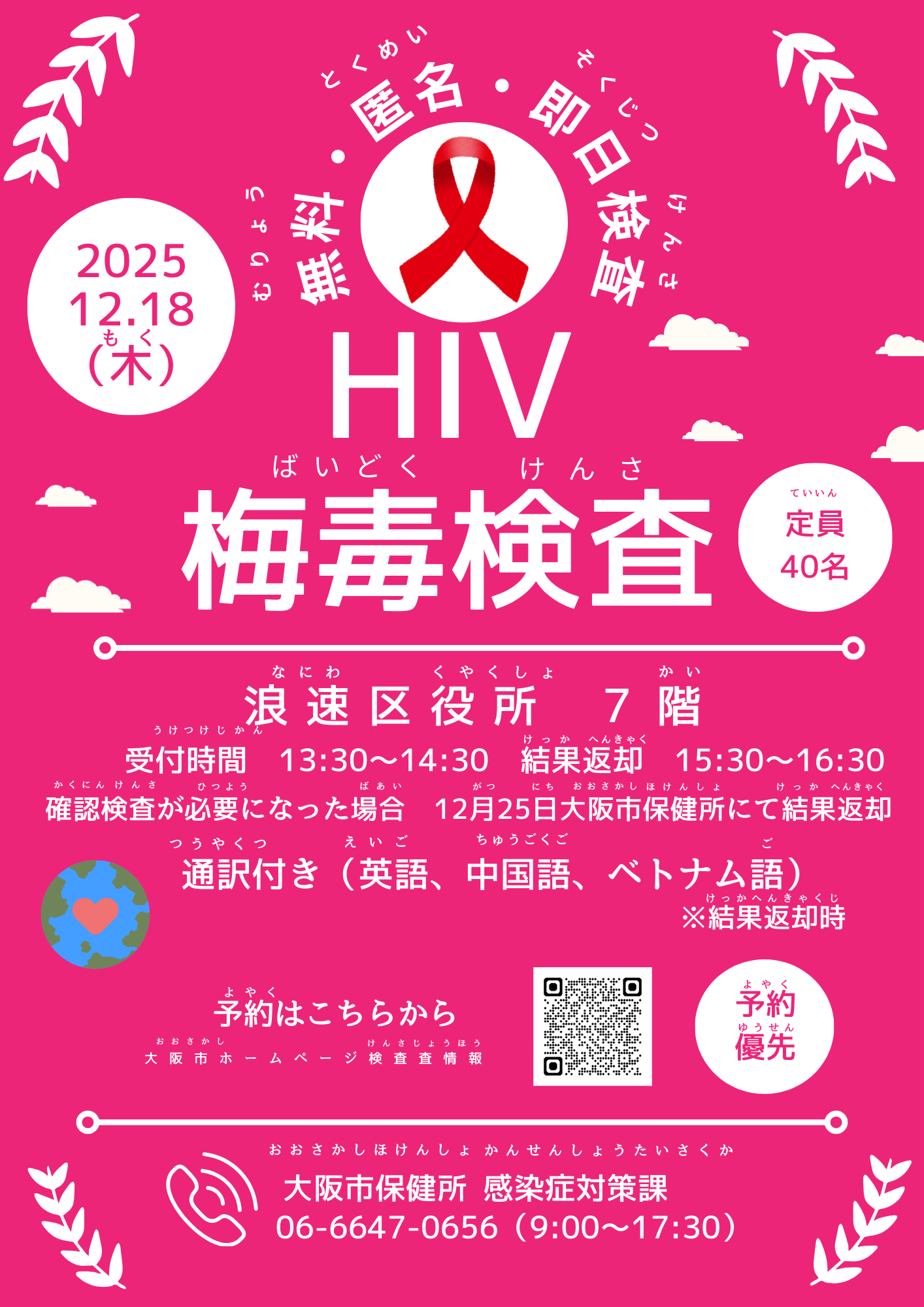 世界エイズデーイベントとして特設会場(浪速区役所)にて、HIV・梅毒の検査を実施します。