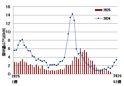 定点当たり報告数:定点医療機関からの総患者報告数を定点医療機関数で割った数