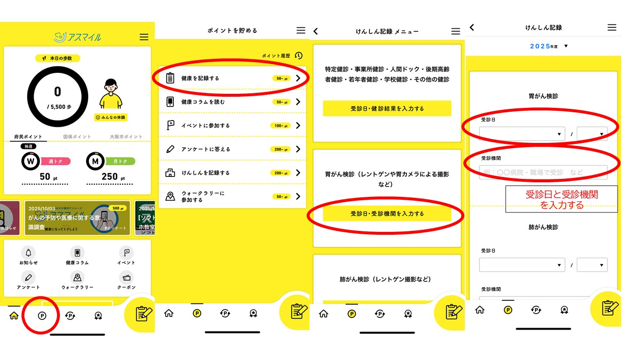 3.「アスマイル」の「けんしんを記録する」に、受診日と受診機関を記録する