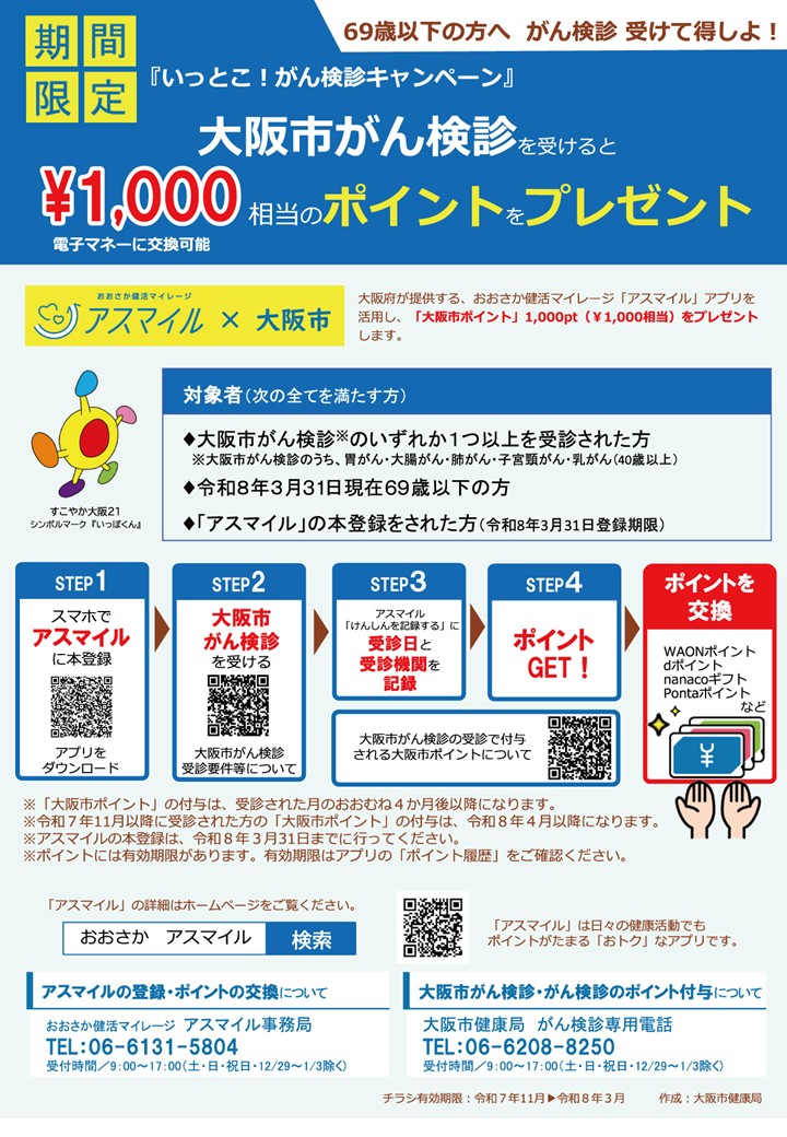 - 大阪市がん検診を受診すると、アスマイルの「大阪市ポイント」1,000円相当をプレゼント!