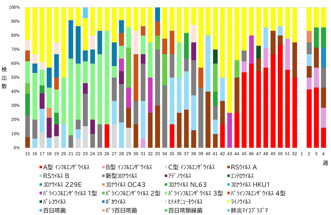 検体採取週ごとの病原体(ウイルス20項目・細菌4項目)の陽性割合