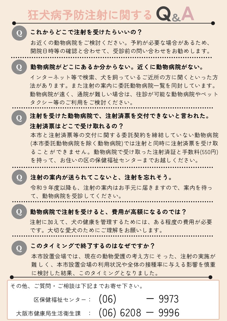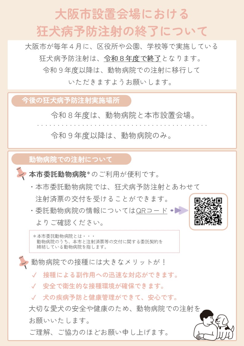大阪市では毎年4月に区役所や公園、学校等に狂犬病予防注射会場を設置し、狂犬病予防集合注射を実施してきました。一方で、動物愛護及び動物福祉に対する社会の理解及び関心の拡大、動物病院数の増加、衛生的な注射環境の確保といった狂犬病予防注射を巡る環境が変化する中で、本市設置会場は屋外のため犬の逸走、咬傷事故やワクチンの副作用による体調の急変に対応できないこと、ペットの健康管理及び疾病予防のためには狂犬病予防注射に加えて特定の動物病院に定期的に掛かるなど獣医師との緊密な連携が不可欠であり、狂犬病予防注射を受けているだけでは不十分であることから事業の見直しを検討してきました。