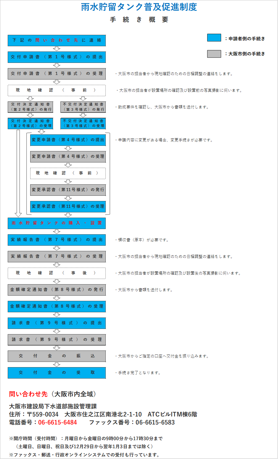 - 雨水貯留タンクの購入前に、交付申請書の提出、設置場所の現地確認(事前)が必要です。