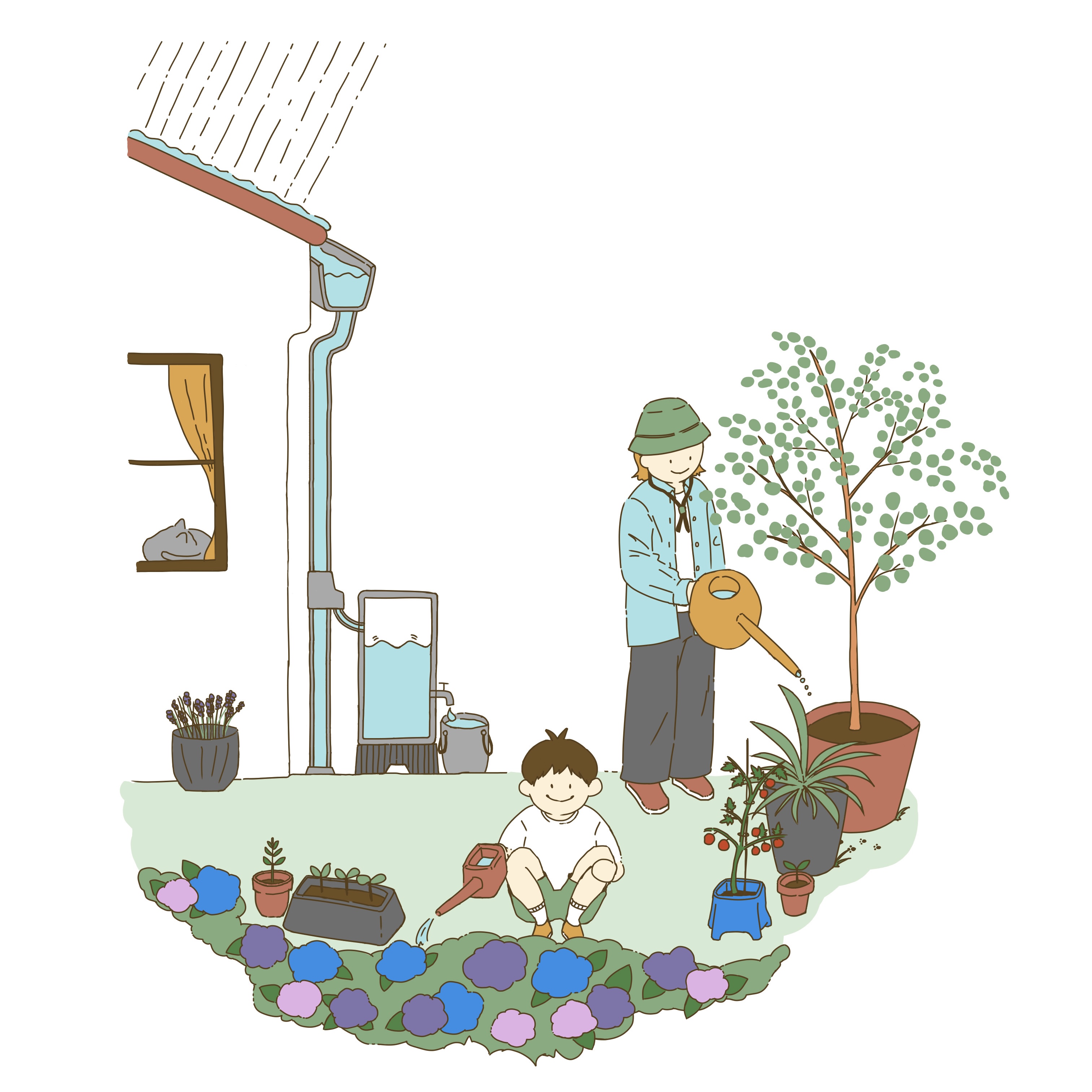 雨水(あまみず)を貯めてみませんか?貯めた雨水(あまみず)は、植木の水やりや打ち水などにご利用いただけます。
