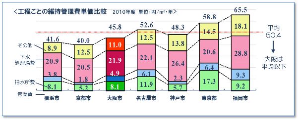 大阪市の下水道部門によるマネジメントは、運営管理費・建設費の最適化により、非常に低廉な下水道使用料を実現しています。