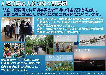 平成29年度には、大阪港150周年事業の一環である歴史展示会に参加しました。平成29年7月6日から8月10日の1か月間、本庁舎1階市民ロビーにて、「渡り鳥と人をつなぐ野鳥園~大阪港の発展と環境保全~」をテーマに野鳥園の成り立ちや現在の環境保全事業、環境学習会の様子を紹介するパネルやポスターを展示し、野鳥園に関する様々な情報を発信しました。