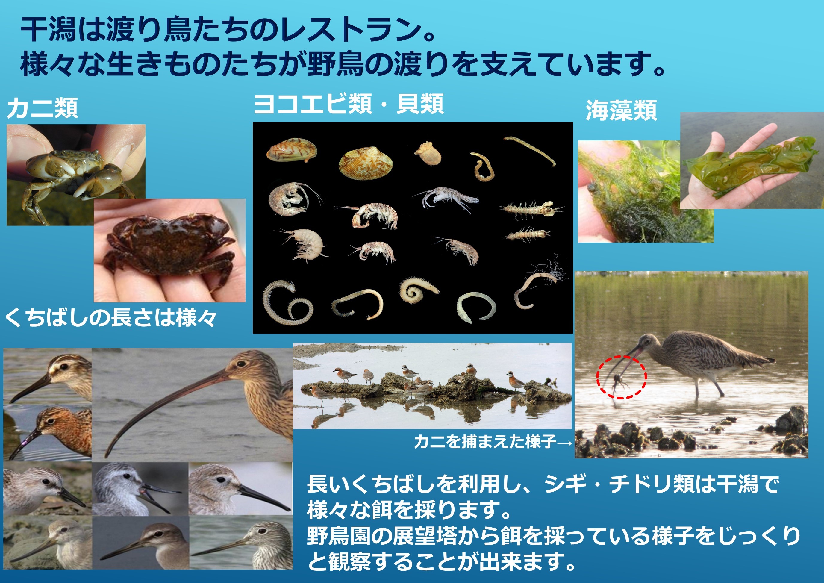 野鳥園には年間約150種類の野鳥が訪れます。中でも注目は、近年、世界的に減少傾向にあるシギやチドリなどの渡り鳥が飛来していることです。渡り鳥たちは、春はシベリアへ、秋はオーストラリアへ長距離移動をする途中に、休息のため野鳥園へ立ち寄ります。次の旅に備え、野鳥園で小さなエビやカニ、ゴカイなどのえさを採ります。渡り鳥たちにとって豊かな干潟はなくてはならない大切な存在なのです。渡り鳥を支え、また、渡り鳥をはじめとする様々な野鳥と人を繋ぐ、この自然豊かな野鳥園で、ゆっくりとバードウォッチングをお楽しみ下さい。