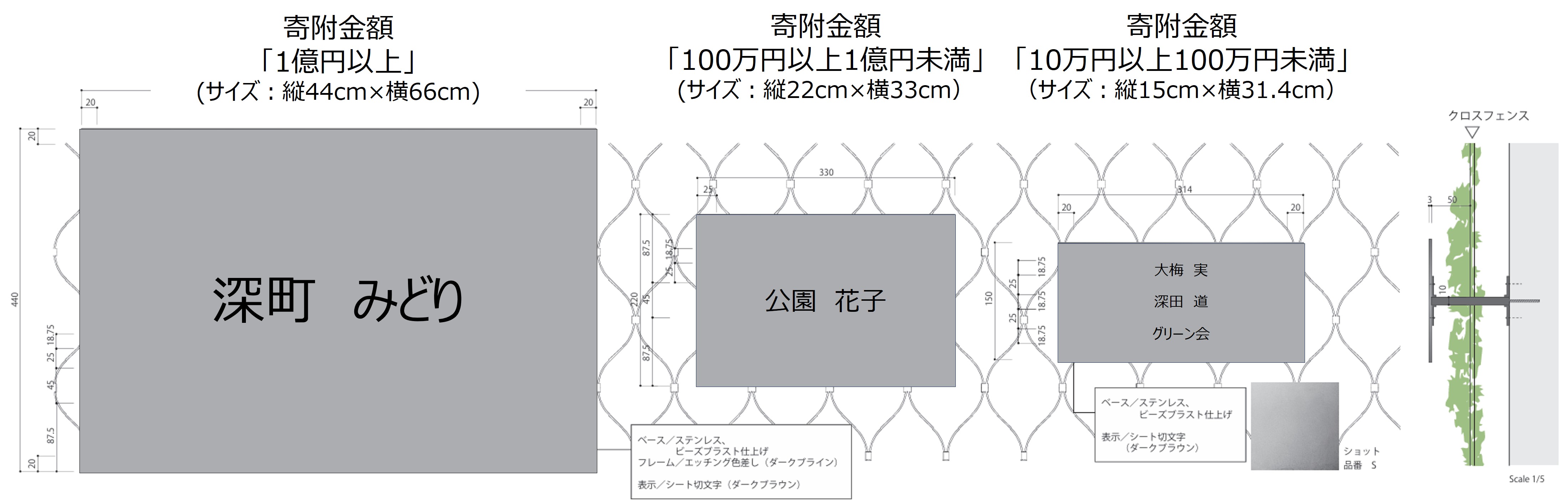 - 「寄附金額1億円以上」、「寄附金額100万円以上1億円未満」、「寄附金額10万円以上100万円未満」の3種類のプレートを用意しており、それぞれサイズが異なります。