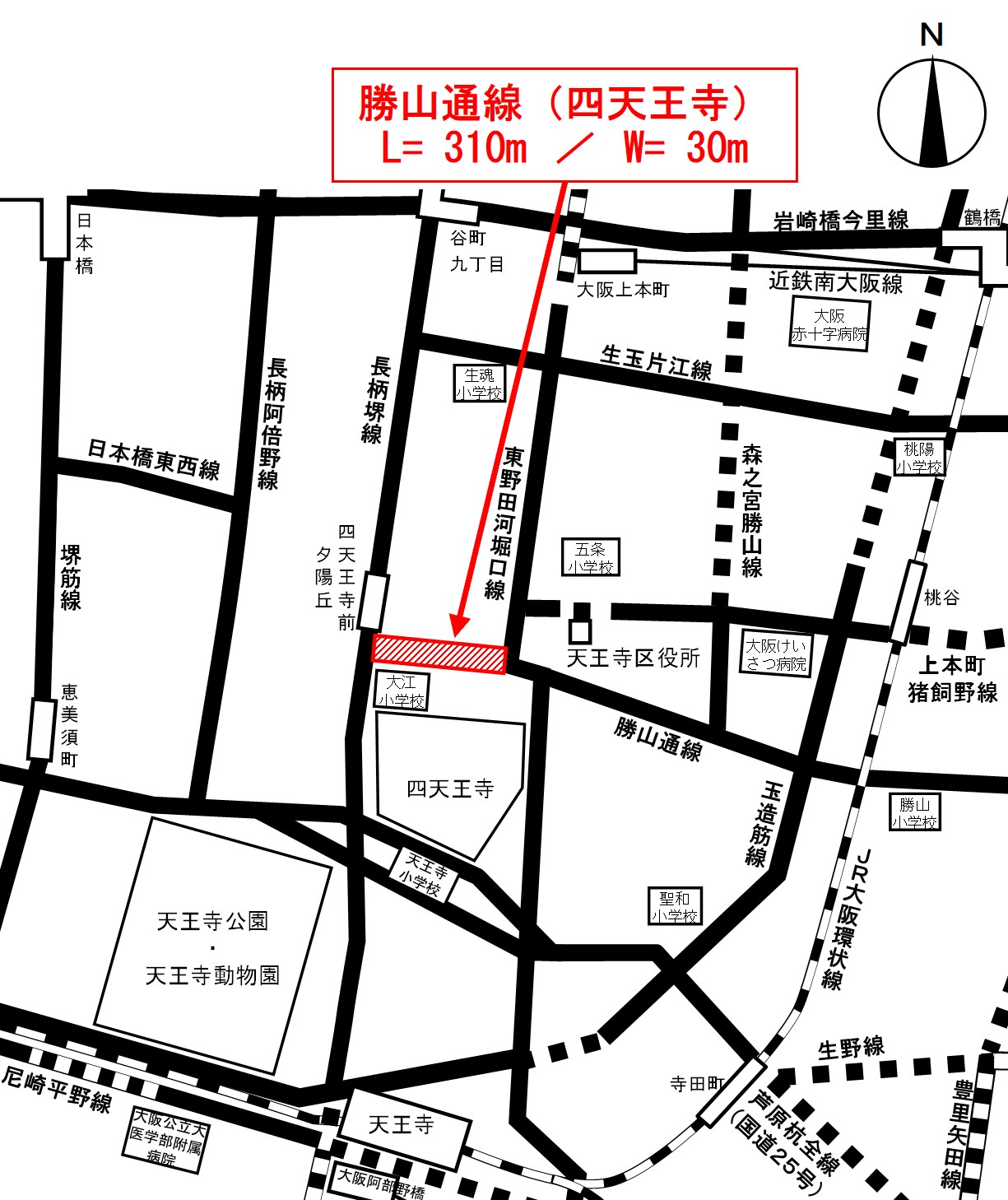 本路線は、天王寺区四天王寺地区から生野区巽地区を結び、大阪市南部の主要ターミナルである天王寺地区と東大阪を東西に連絡する幹線道路である。当該事業は、本路線の西端にあたる都市計画道路長柄堺線(谷町筋)から都市計画道路東野田河堀口線(上町筋)までの区間を対象に道路整備(道路拡幅)を実施するものである。