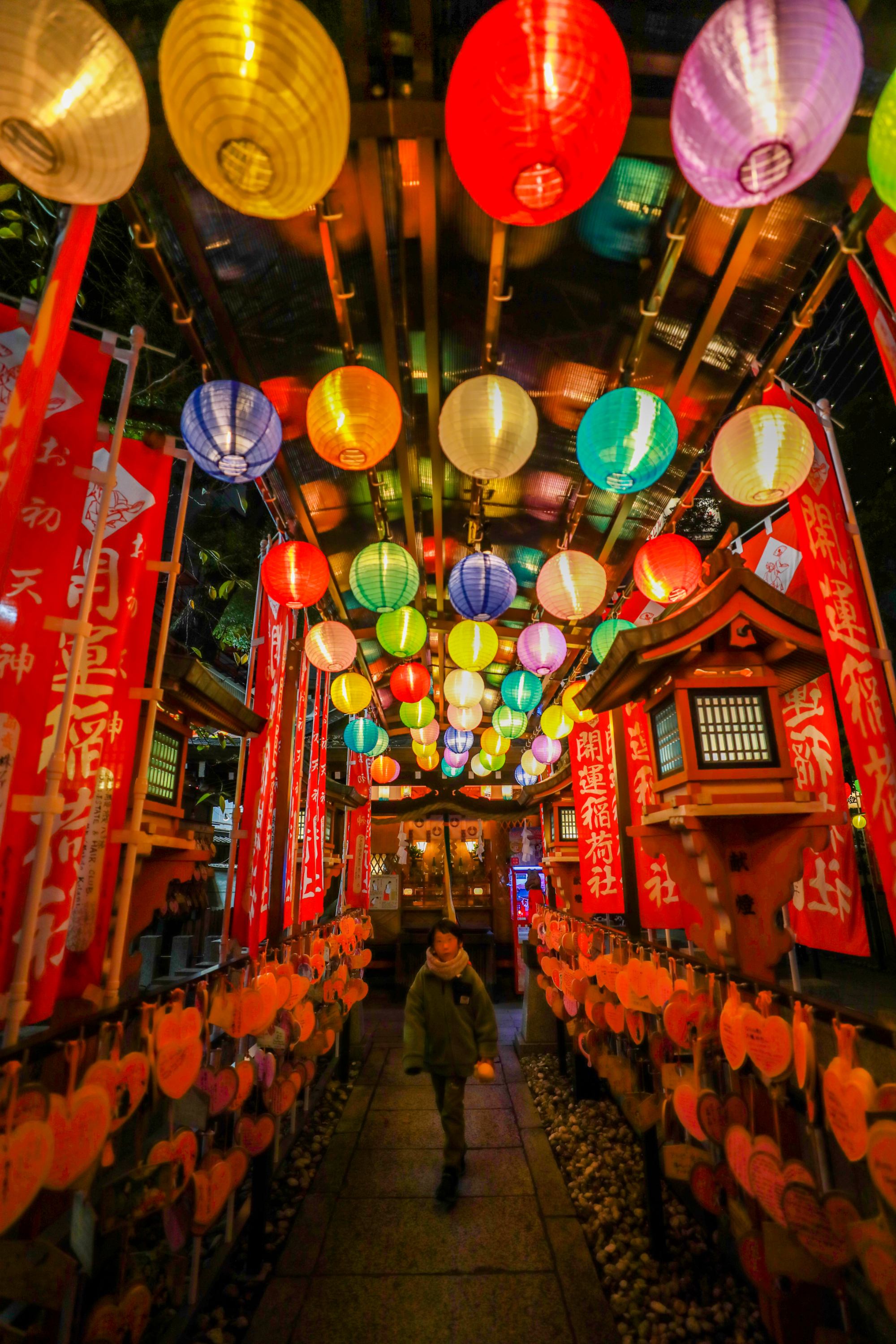 カラフルな提灯にハート♡絵馬がとっても可愛い素敵な神社で、夜だったので特に提灯が光って華やかでした。