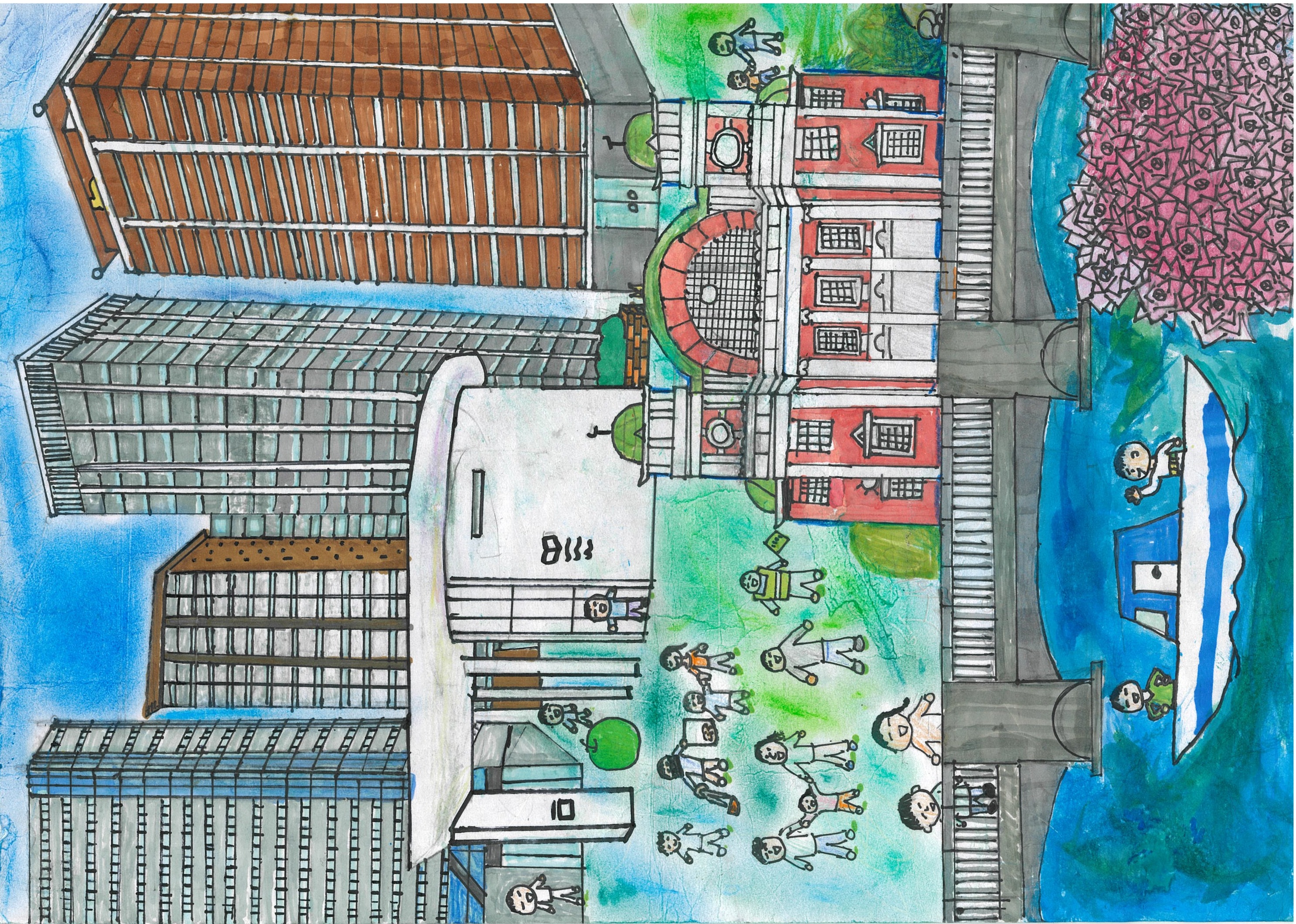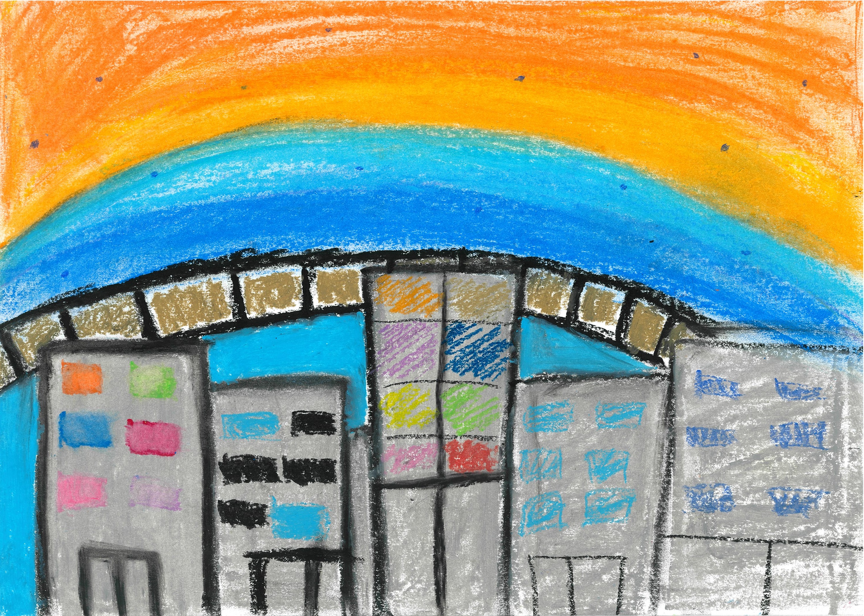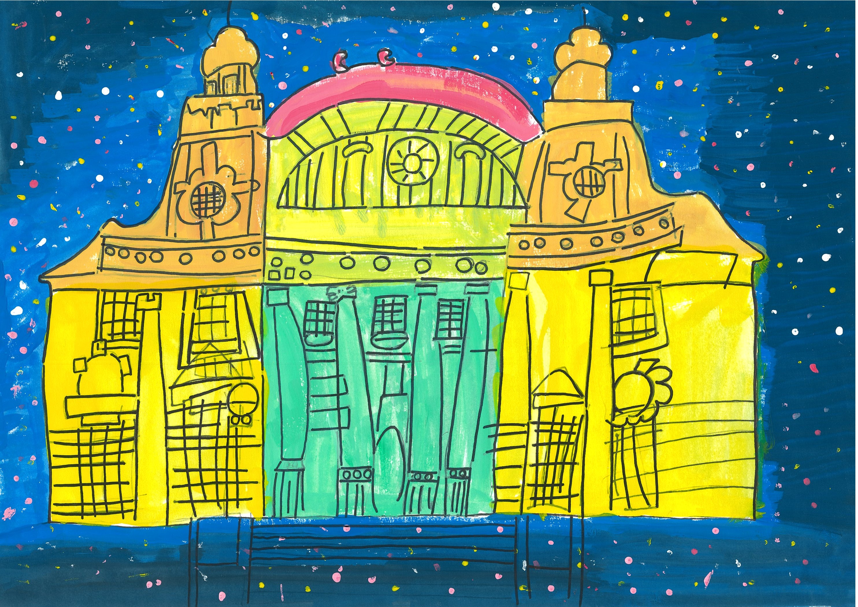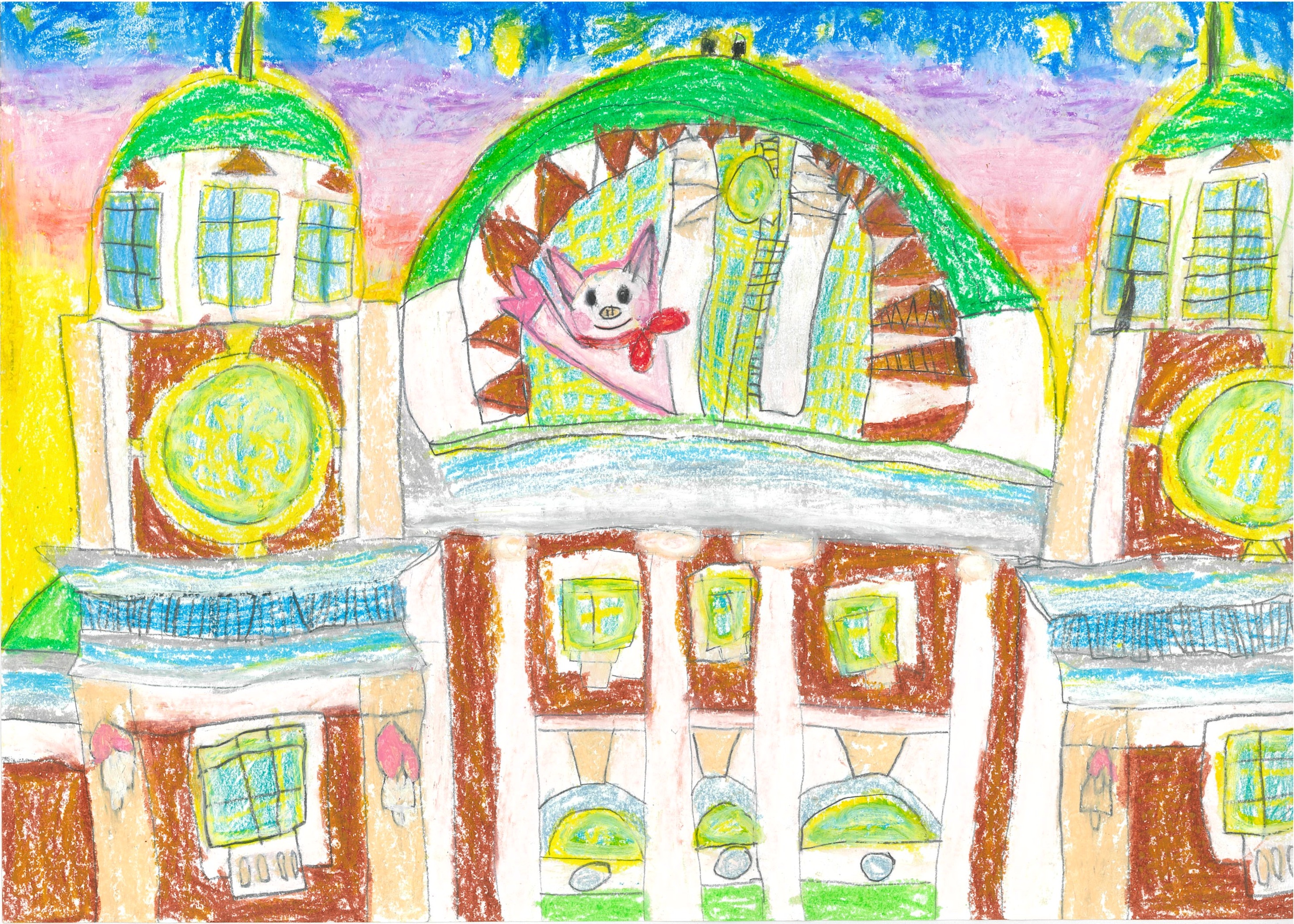 PR:私の大好きな北区にある大阪市中央公会堂を描きました。私は明るい時間にしか行ったことがありません。夜になると光り輝く大阪市中央公会堂が見ることができる期間があることをテレビで知りました。大きくなったら見にいきたいという思いで一生懸命描きました。初めての絵の具で夜空を表現するのが難しかったです。爪楊枝に絵の具をつけて塗り、星空を表現しました。