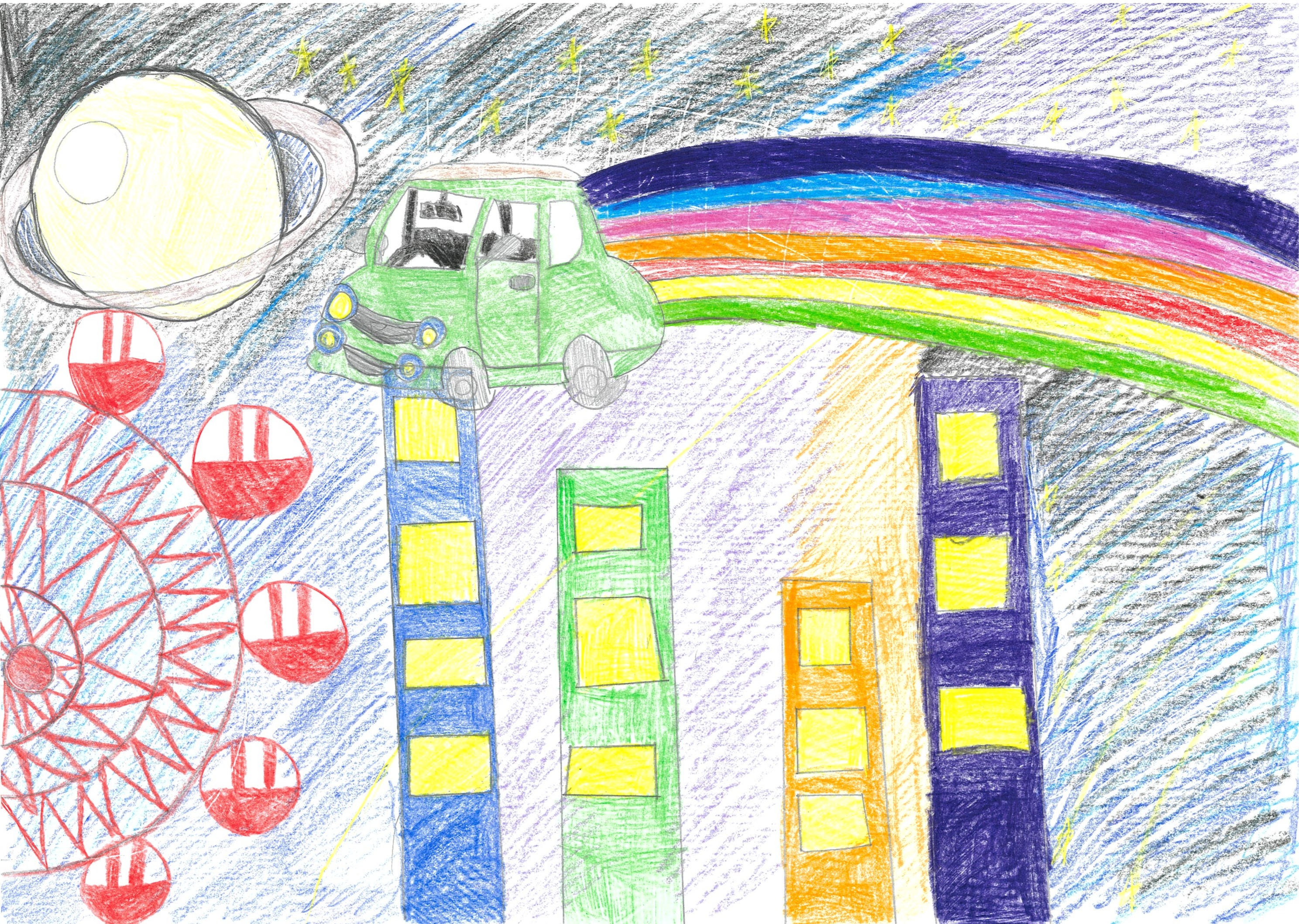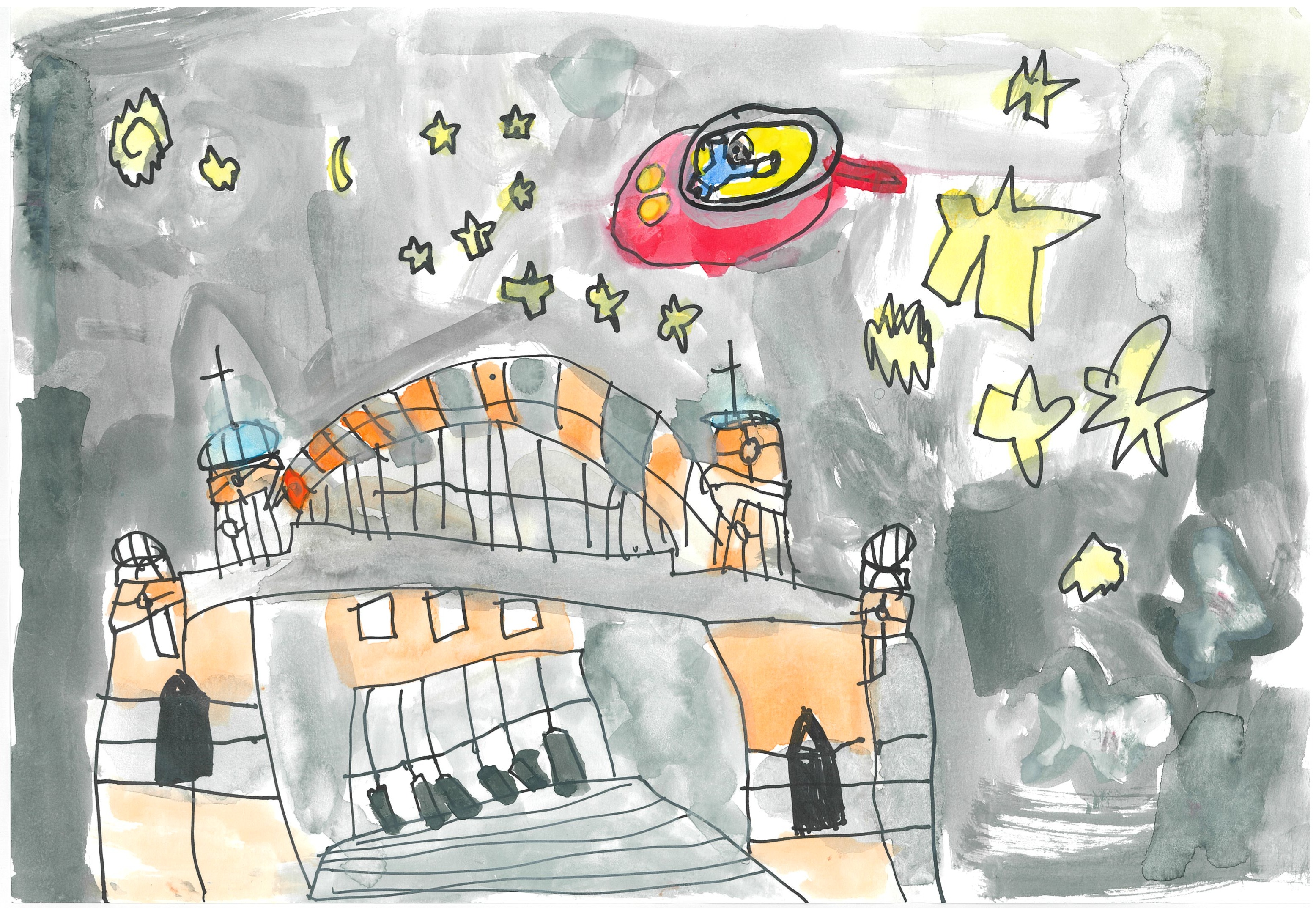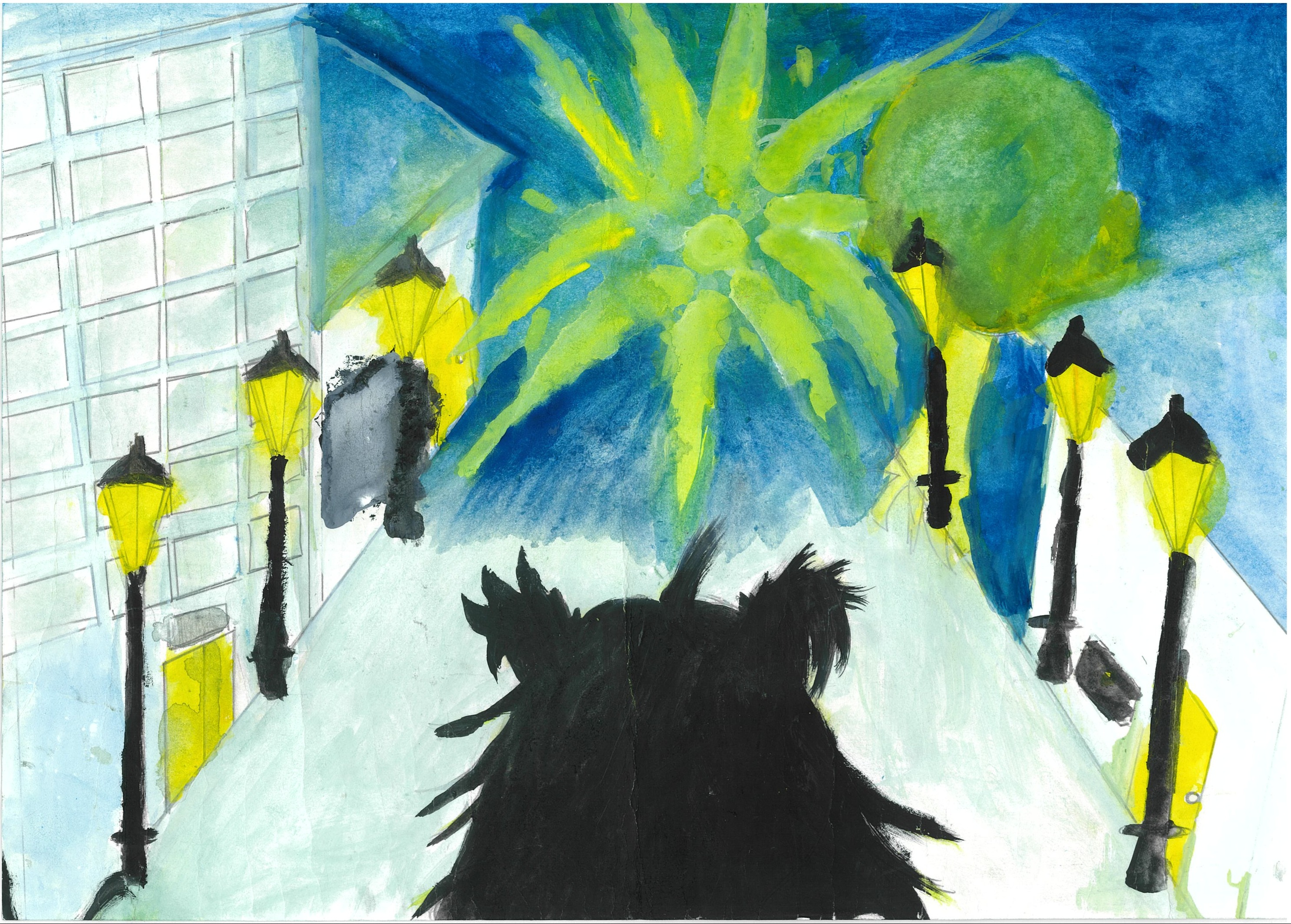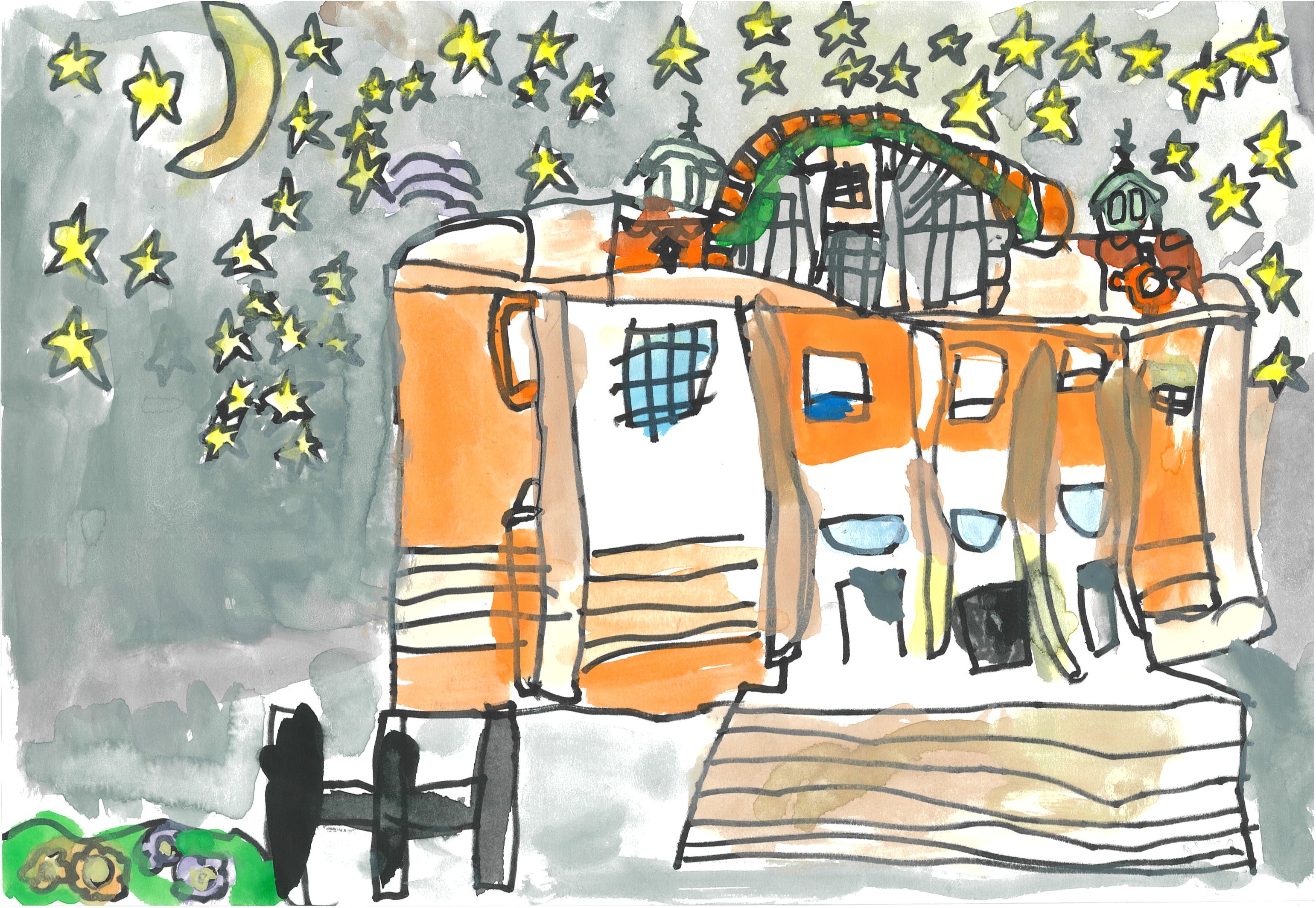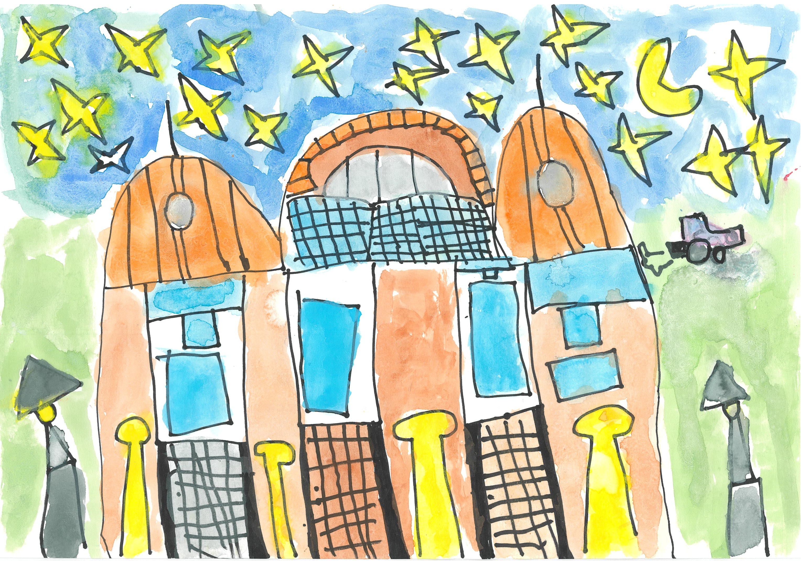 PR:私の大好きな北区にある大阪市中央公会堂を描きました。私は明るい時間にしか行ったことがありません。夜になると光り輝く大阪市中央公会堂が見ることができる期間があることをテレビで知りました。大きくなったら見にいきたいという思いで一生懸命描きました。初めての絵の具で夜空を表現するのが難しかったです。爪楊枝に絵の具をつけて塗り、星空を表現しました。