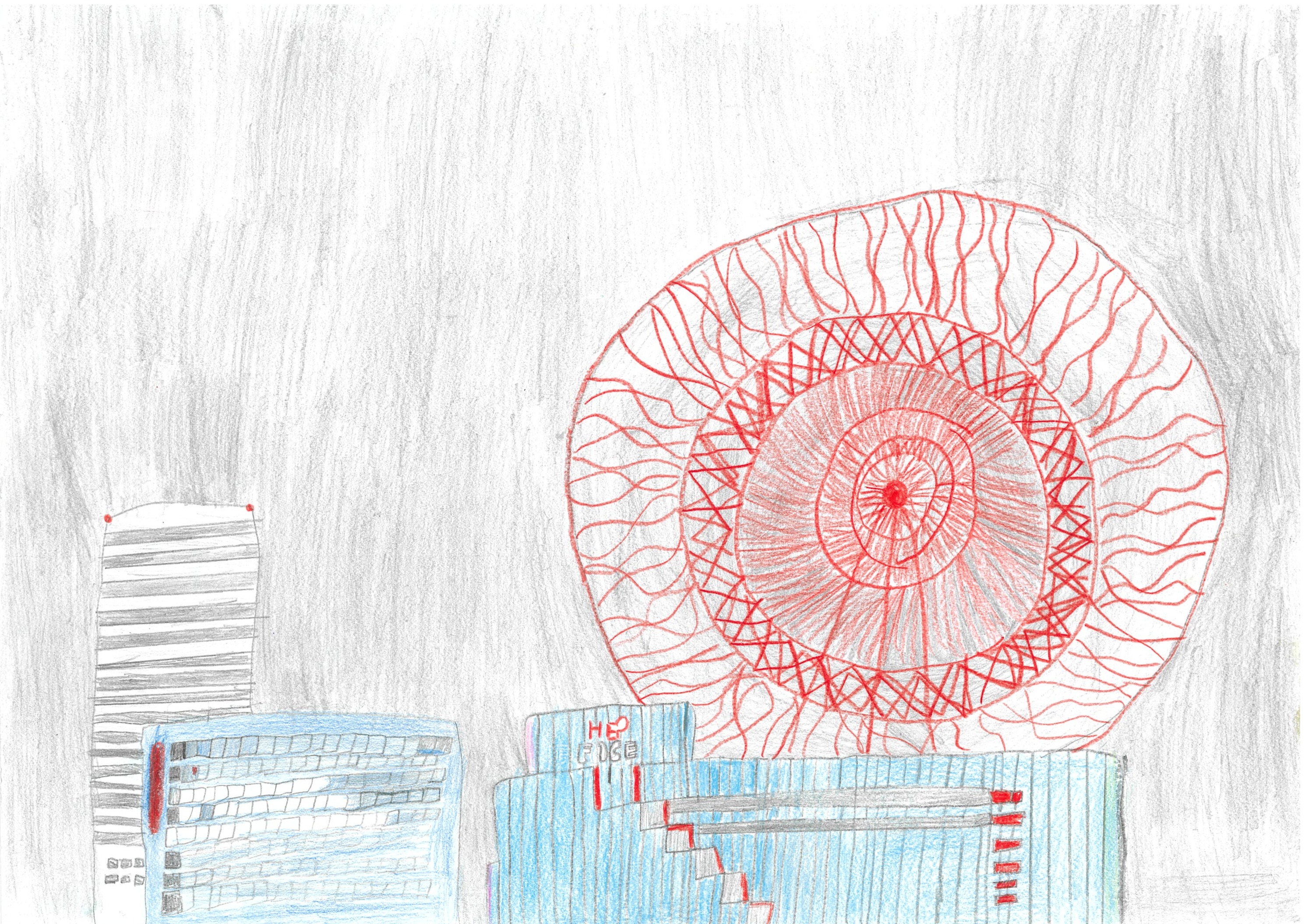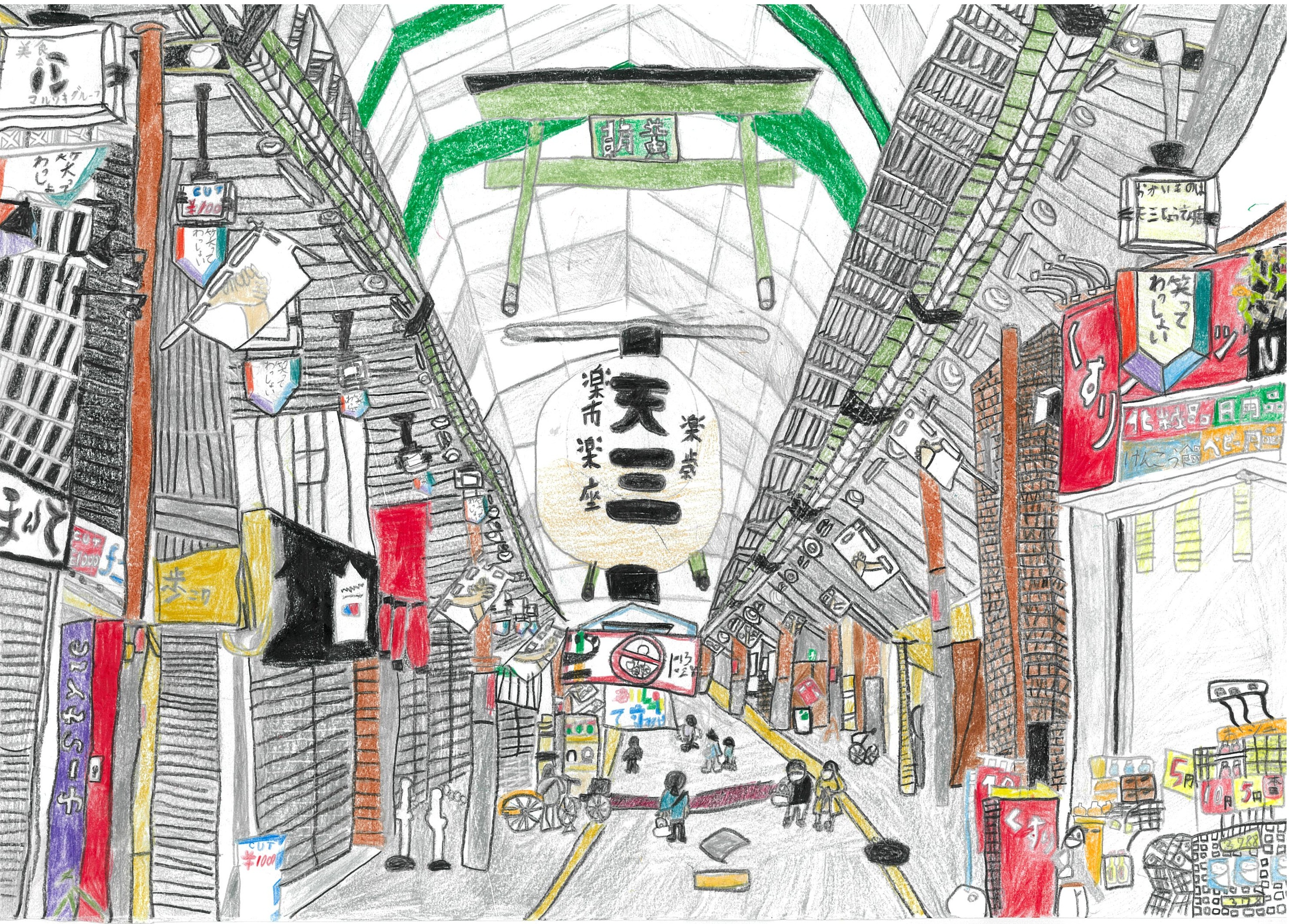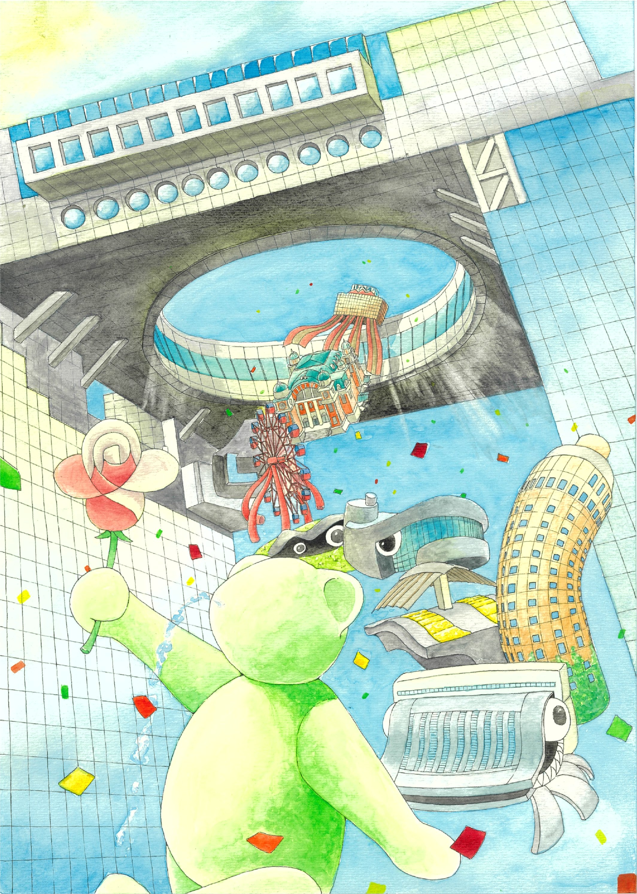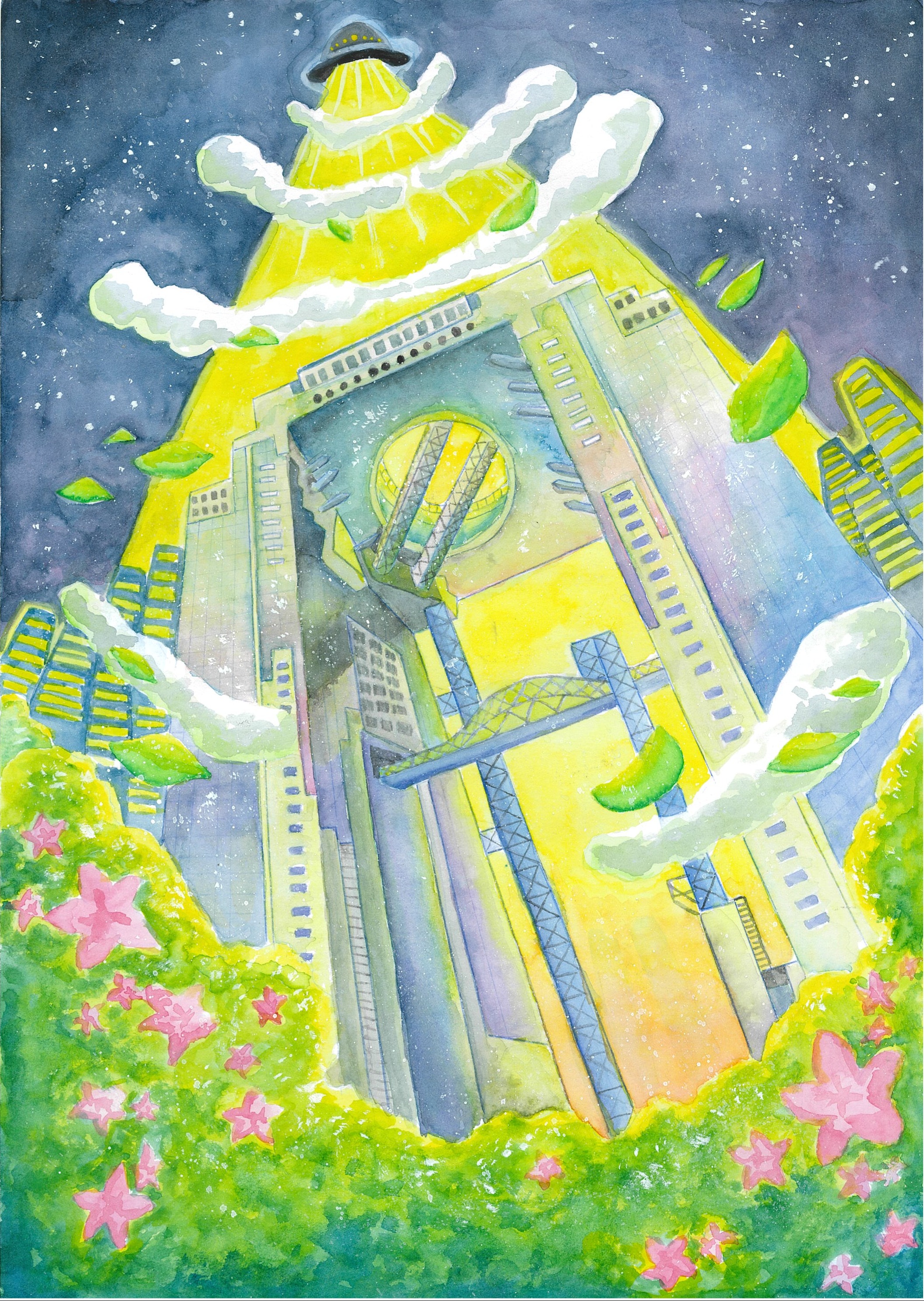 PR:私にとってスカイビルは毎日のように見上げる身近な存在です。そんなスカイビルの魅力が宇宙にも届くことを願って描きました。