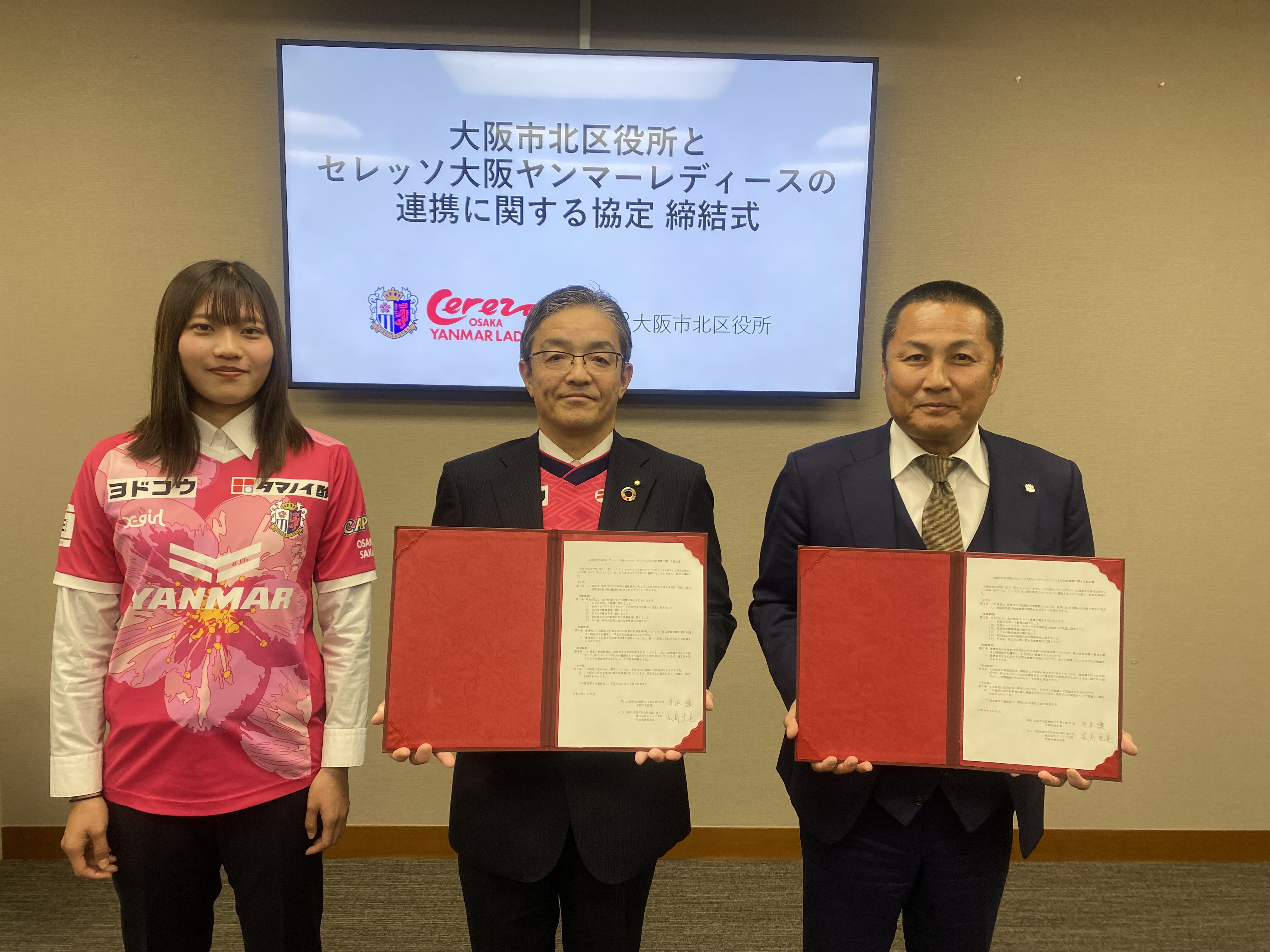 大阪市北区役所は、地域活性及び地域課題の解決をめざすことを目的として、令和8年1月20日にセレッソ大阪ヤンマーレディースと包括連携協定を締結しました。