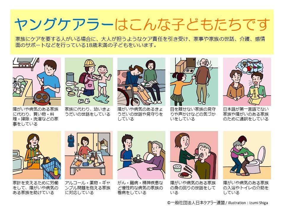 「ヤングケアラー」とは、子ども・若者育成支援推進法において、「家族の介護その他の日常生活上の世話を過度に行っていると認められる子ども・若者」とされており、こどもにおいては、家事や家族の世話などに時間を費やすことで、友達と遊ぶことや勉強することができなかったり、学校に行けなかったり、遅刻するなど、こどもらしく過ごせていない可能性があります。また若者においては、自立に向けた移行期として必要な時間(勉強・就職準備等)を奪われたり、ケアに伴い身体的・精神的負荷がかかったりすることによって、負担が重い状態になっている可能性があります。
