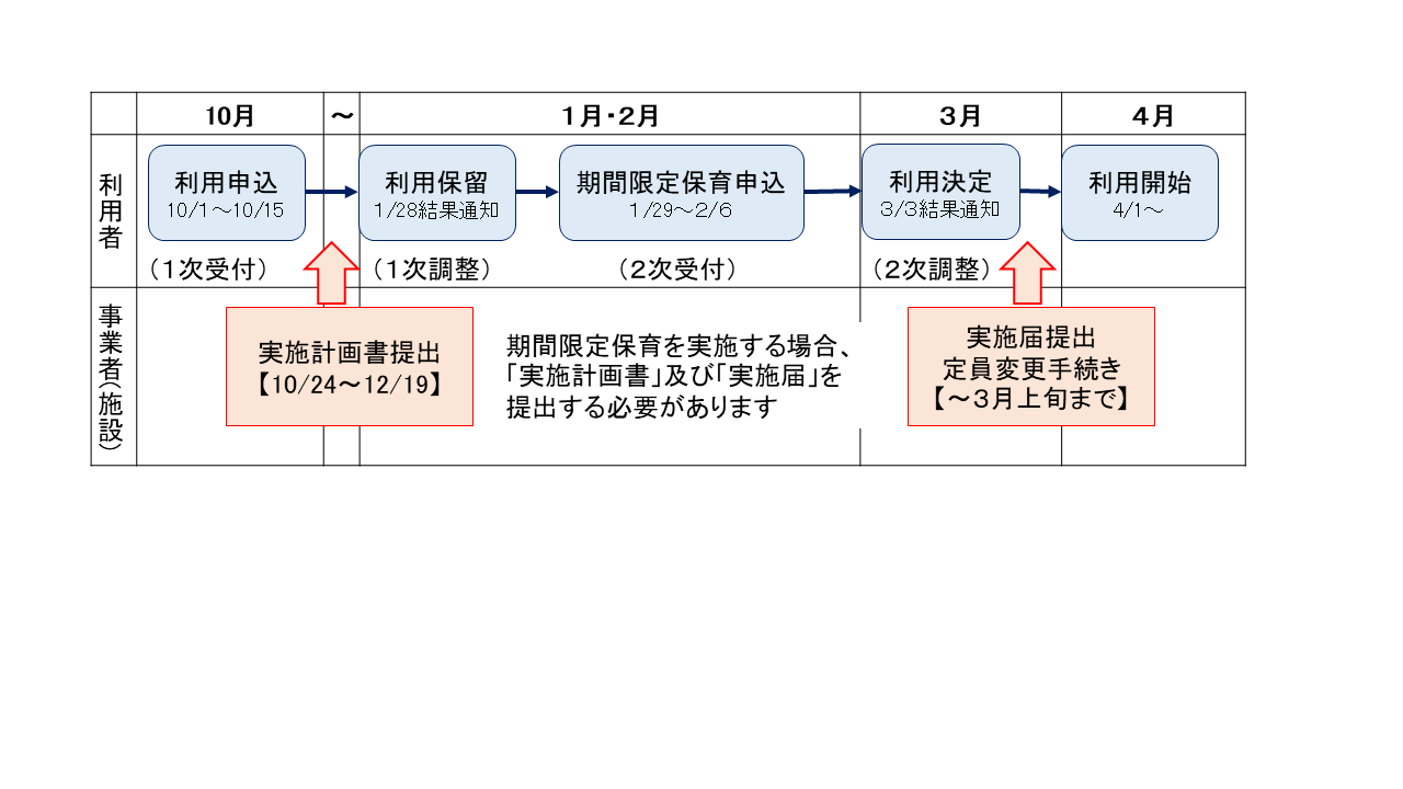・「期間限定保育」を実施する場合でも、各年齢の認可定員を超えての児童の受入をすることはできません。「期間限定保育」の実施により認可定員を超過する場合は、「期間限定保育」実施までに認可定員の変更手続きを実施してください。