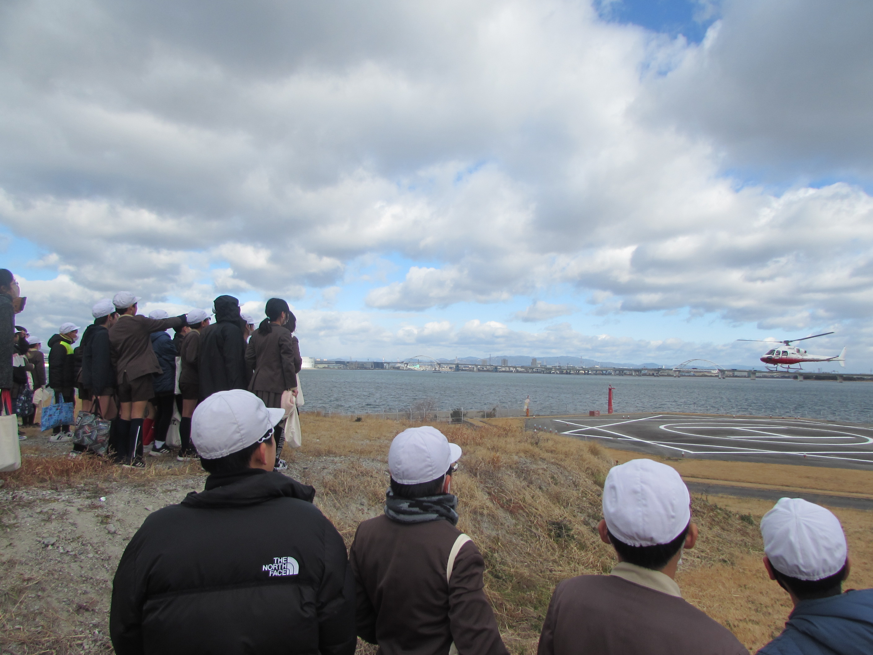大阪ヘリポートの高台から、ヘリコプター(空飛ぶクルマの代用)が着陸する様子を見学しました。