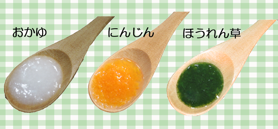 口を閉じてゴックンと飲み込む練習をするので、ドロッとしたものから食べていきます。新しい食品を食べさせるときには、1日1品1さじからはじめ、赤ちゃんのペースで増やしていきましょう。レシピはこちらにも色々ありますし、3か月健診でお配りしている「にこにこ」の冊子も参考にしてください。この時期の離乳食に、調味料はいりません。素材の色々な味を体験させてあげてください。