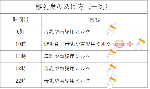 1日1回、授乳のタイミングを離乳食の時間にしましょう。離乳食は、毎日同じ時間に決めて生活のリズムをつけていきます。体も慣れてきて赤ちゃんも保護者も過ごしやすくなります。離乳食後もその他の授乳も、好きなだけ母乳や育児用ミルクを飲んでもらって構いません。まだまだこの時期の栄養源は母乳や育児用ミルクになります。