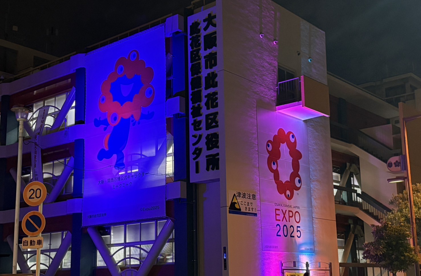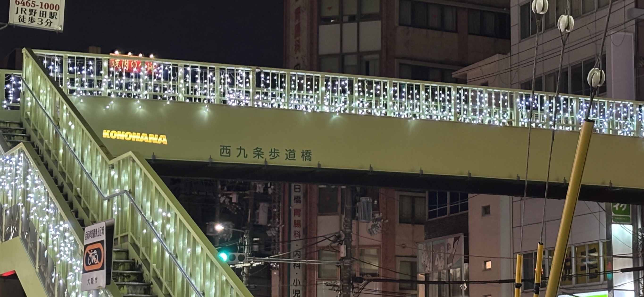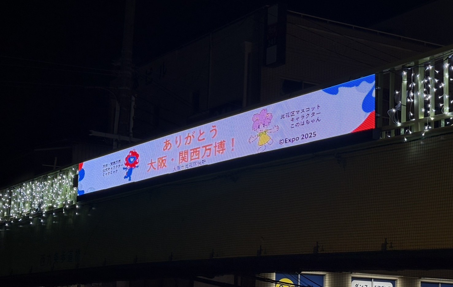 此花区・夢洲で開催された2025年大阪・関西万博(以下「万博」といいます。)の開催期間中において、万博への参加を促し、多くのインバウンド客等を区内に誘導することや、区民のみなさまが魅力を感じ、まちの盛り上げと魅力の向上につながるための施策として、西九条駅周辺などにイルミネーションを施しました。万博や日本文化をモチーフとした「魅力あるスポット・景観」を創り出すことで、万博への参加促進、此花区内のまちの盛り上げや回遊性の向上を目指しました。