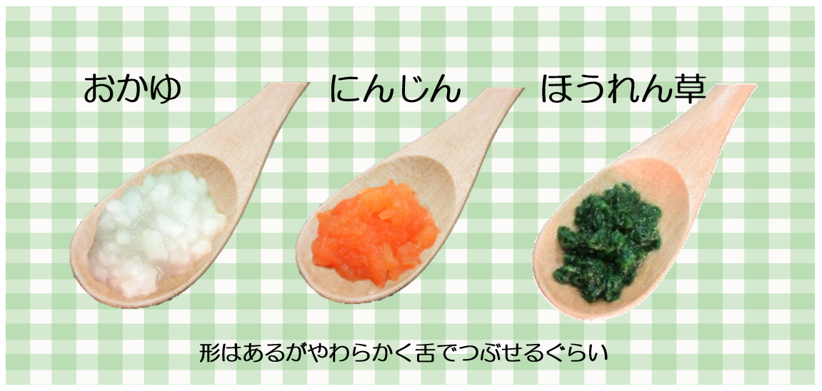 さて、離乳食を始めて1~2か月するとゴックンに慣れてきたでしょうか。段々とステップアップしていきましょう。この頃には、食品の種類を増やし、1日2回なるべく時間を決めて食事の時間を作りましょう。舌の動きが上手になってくるので、舌と上顎でつぶせるお豆腐くらいの固さで形があるものを食べていく練習をしましょう。