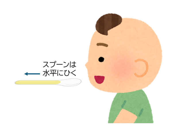 平らなスプーンを下唇にのせ、上唇が閉じるのを待ちましょう。斜めに流しこんだり、スプーンを上唇にこすりつけたり、口の奥に入れ過ぎたりしないように注意しましょう。