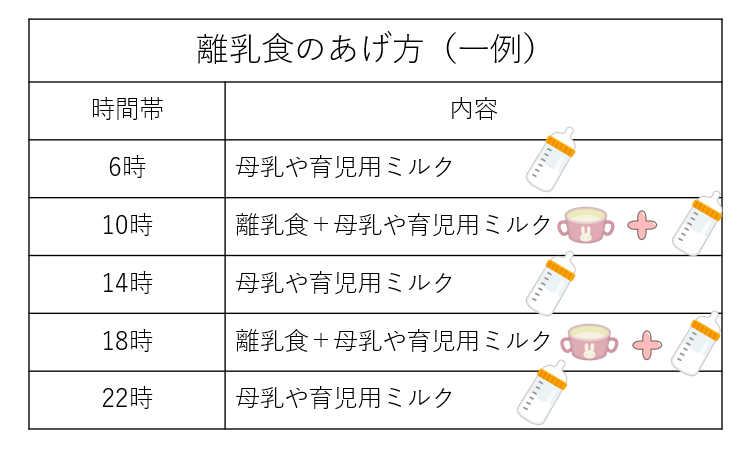 1日1回だった離乳食を、1日2回に増やしましょう。離乳食は、毎日同じ時間に決めて生活のリズムをつけていきます。離乳食後の母乳や育児用ミルクは飲みたいだけ飲ませましょう。離乳食とは別に、母乳は授乳のリズムに沿って飲みたいだけ、育児用ミルクは1日3回程度飲ませましょう。
