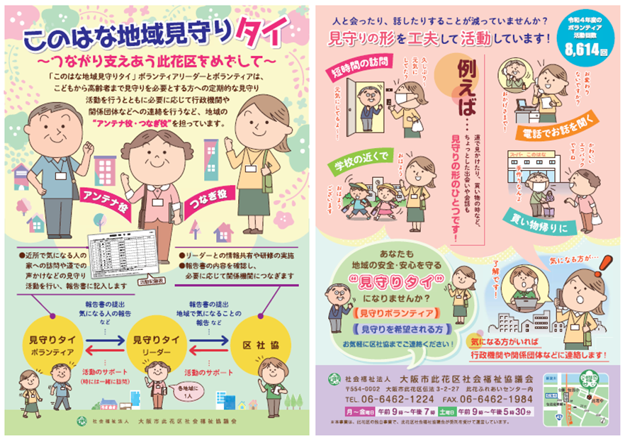 近年の核家族化など、家族形態の変化により、近所づき合いを含め人との関係が希薄化し、地域から孤立して生活する高齢者や、本来大人が担うと想定されている家事や家族の世話などを日常的に行っているこども(ヤングケアラー)が増加しています。こうした中で此花区では平成25年度から「このはな地域見守りタイ」事業を立ち上げ、地域ボランティアにより、高齢者・障がい者・子育て世帯等に“見守り・声かけ”を行い、潜在的な孤立者を発見し、援助につなげる活動に取り組んでいます。