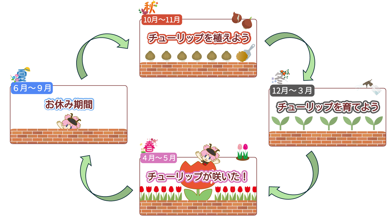 チューリップの球根の植え付け時期は、10月~11月頃が適期です。