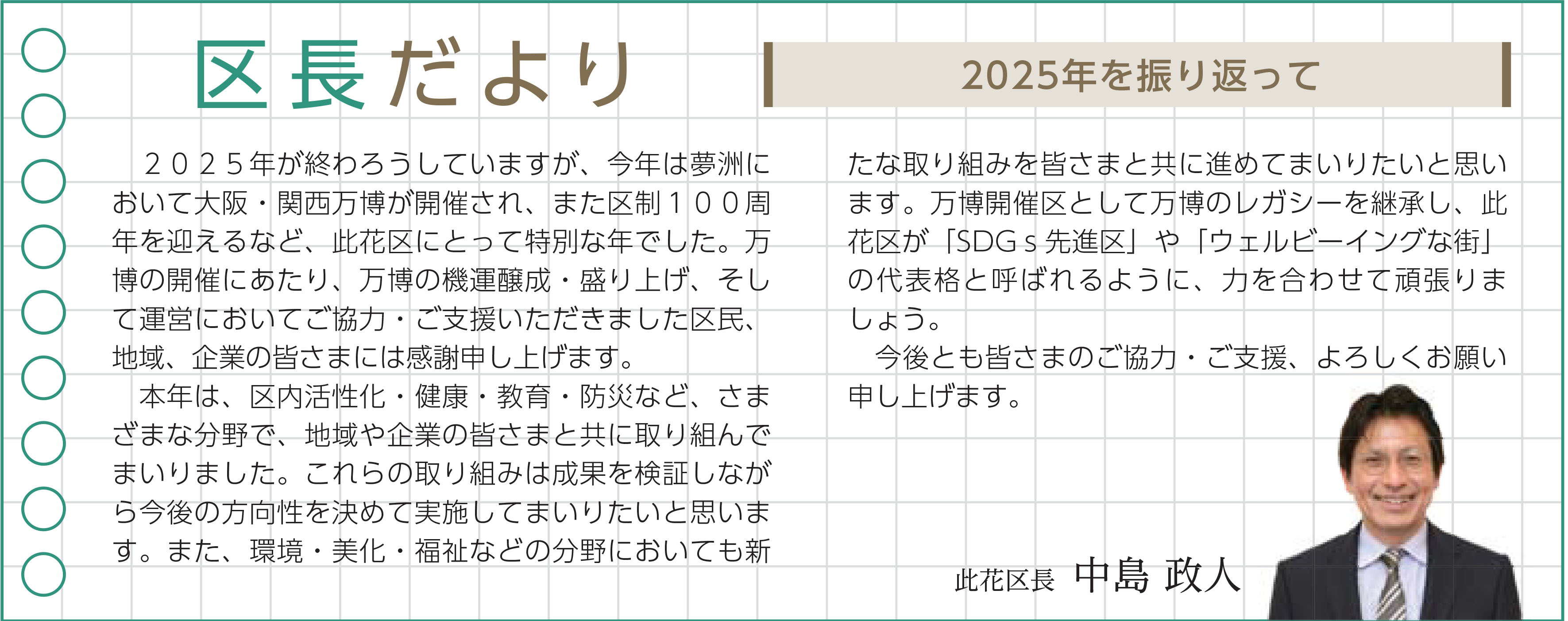2025年が終わろうしていますが、今年は夢洲において大阪・関西万博が開催され、また区制100周年を迎えるなど、此花区にとって特別な年でした。万博の開催にあたり、万博の機運醸成・盛り上げ、そして運営においてご協力・ご支援いただきました区民、地域、企業の皆さまには感謝申し上げます。
