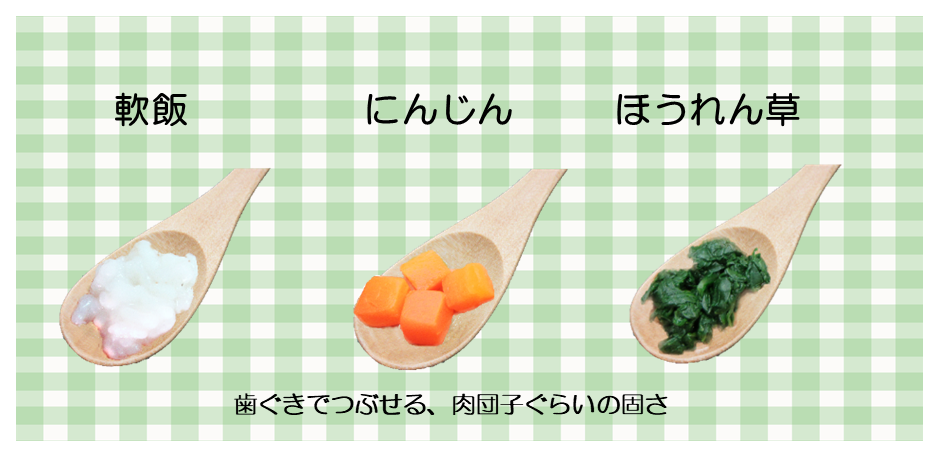 まだまだ、奥歯が生えそろうのには時間がかかりますが、歯ぐきで噛んでいく練習をします。固さは肉団子ぐらいの固さを目安にしましょう。レシピはこちらにも色々ありますし、3か月健診でお配りしている「にこにこ」の冊子も参考にしてください。味付けは、大人よりも薄くすることを意識できると良いでしょう。