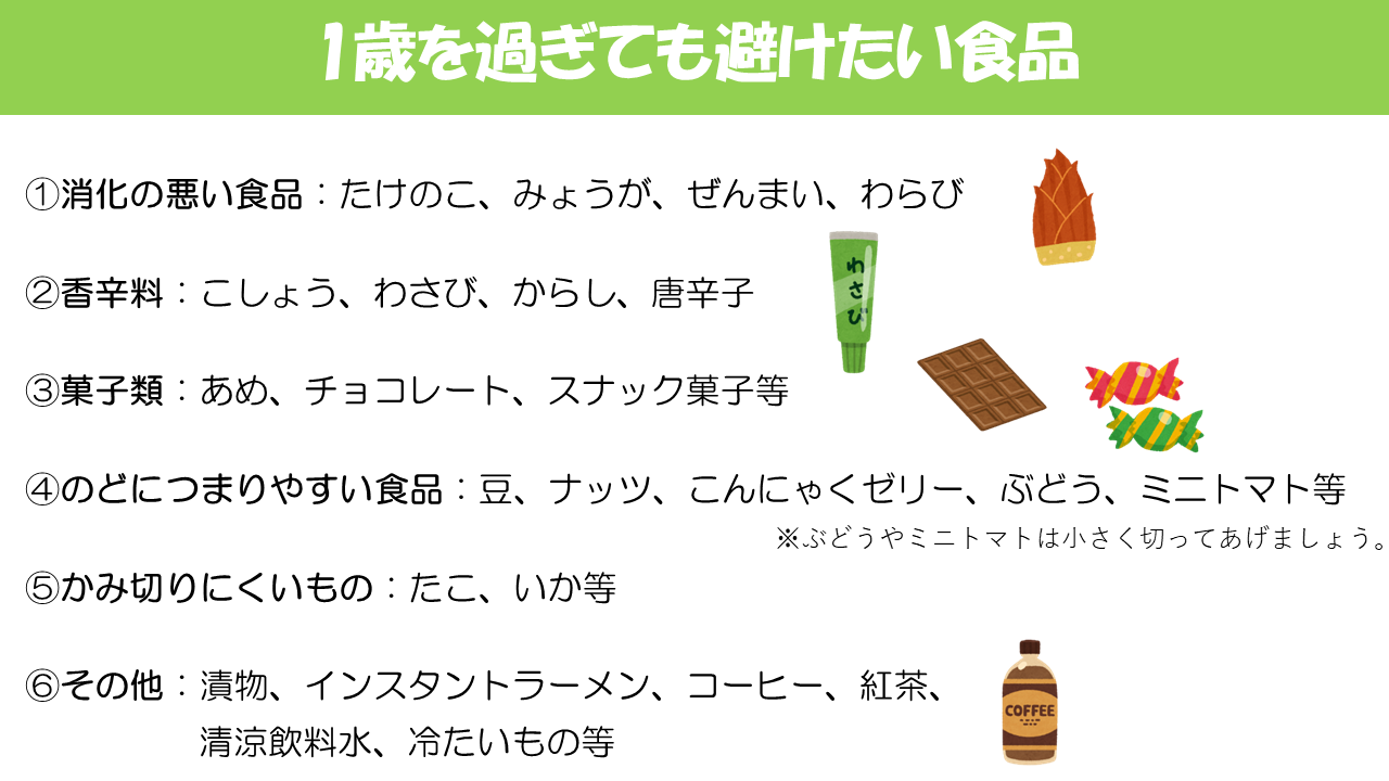 そろそろ同じものに飽きてきます。形、色、味に変化をつけていきましょう。1日3回の食事リズムを大切に、家族と一緒に食事を楽しみましょう。手づかみ食べを十分にさせ、上手になってきたら、スプーンやフォークを使いましょう。歯ぐきで噛める肉団子ぐらいの固さに調理しましょう。前歯でかじりとりができるような大きさのものを食べていくと、食べ物の固さを感知し、奥歯の方に食べ物を運んで噛む動作につながっていきます。このページではよくある疑問を取り上げています。詳しくは、大阪市ホームページも参考にしてください。