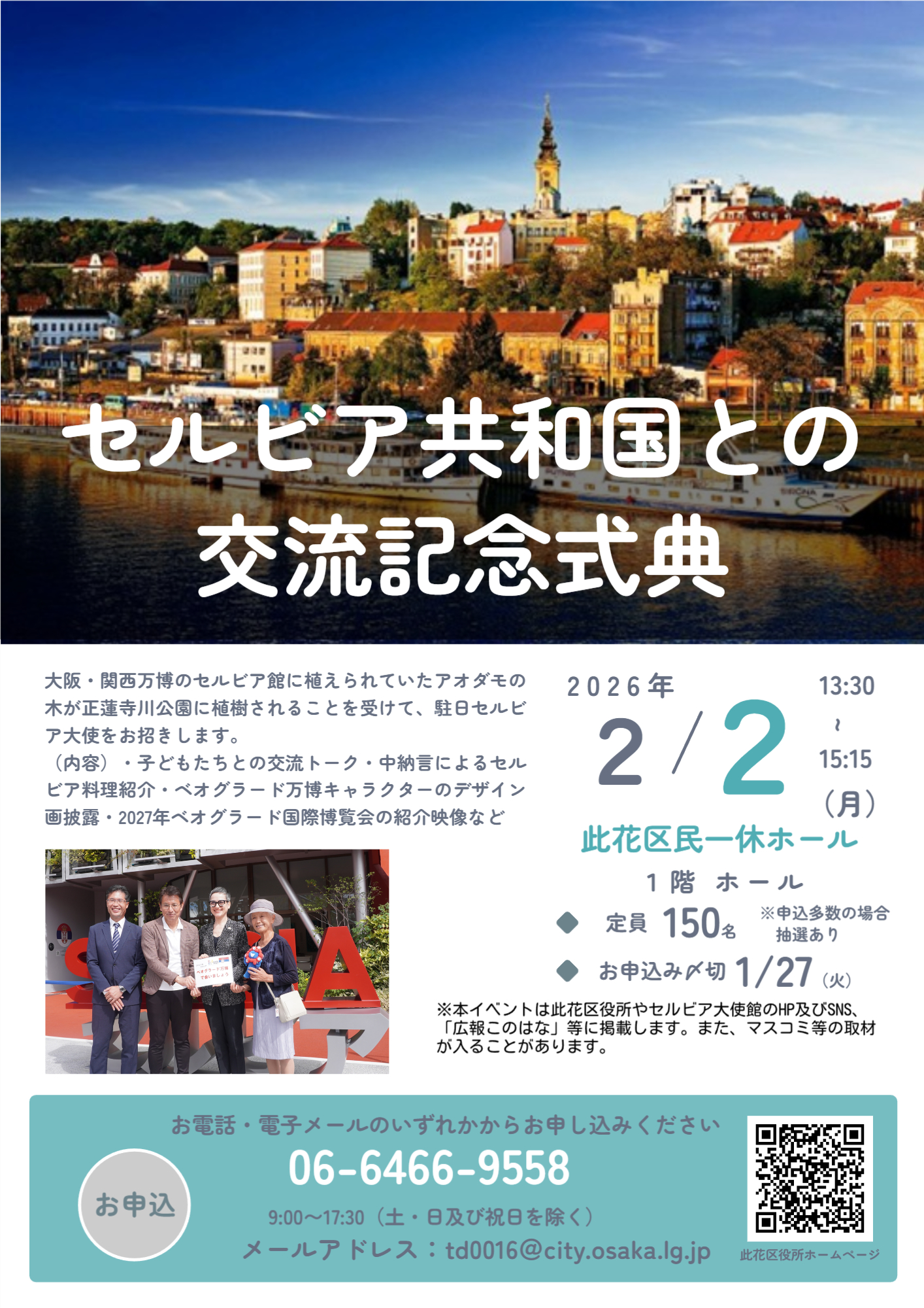 なお、本式典については、セルビアとの交流についてご尽力いただいた此花区万博広報大使「万博おばあちゃん」こと山田外美代さんにもご参加いただきます。