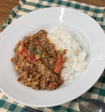 - トマトを加え、ひと混ぜしたらAを入れて蓋をして少し蒸し焼きにし、蓋を外しまとまりができるまで炒める。