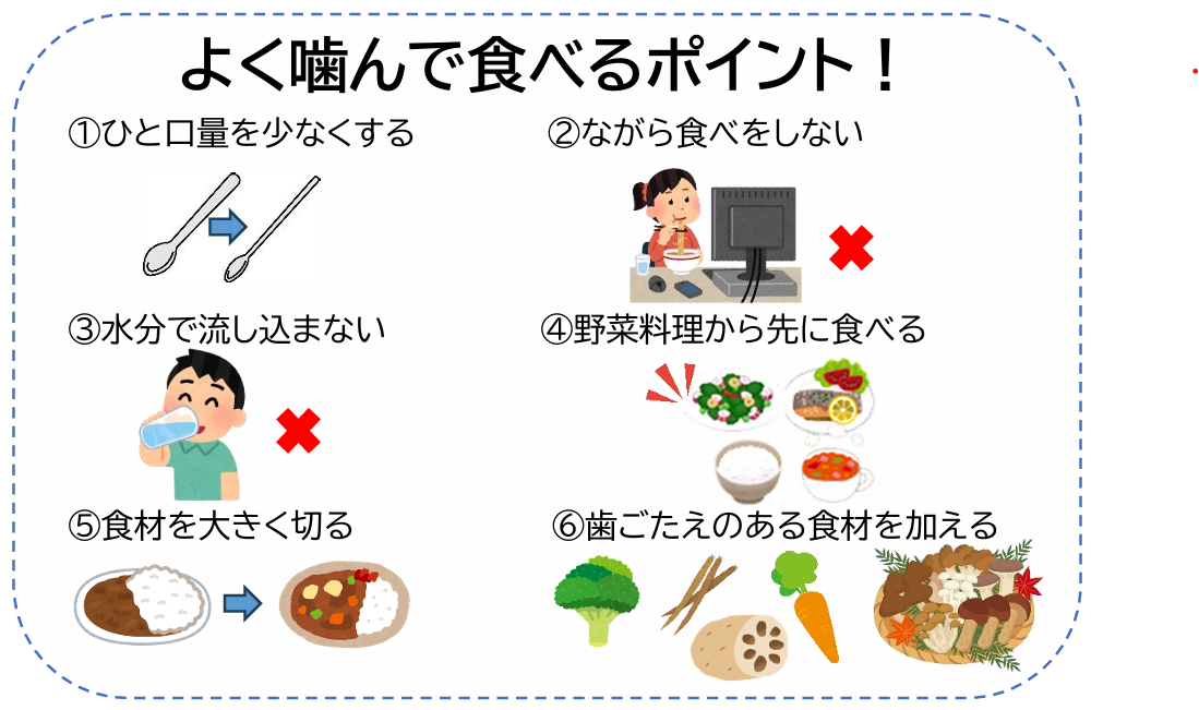よく噛んで食べていますか?噛む動作は何気ないことですが、健康に直結する大切なことです。次の食事からひと口30回を目安によく噛んで食べてみましょう。